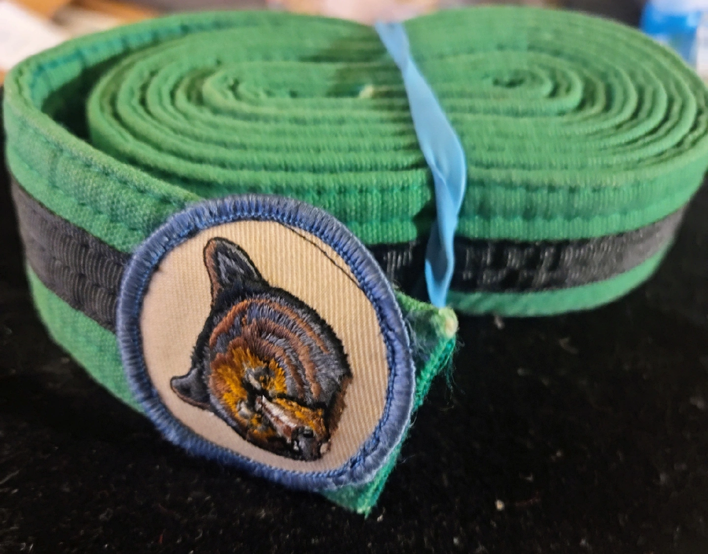 75Selling a green martial arts belt with a black stripe and a patch featuring an animal. It's in good condition and ready for its next owner!
