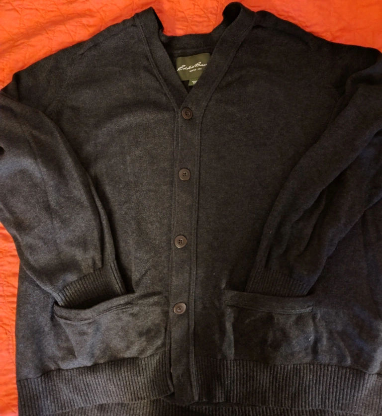 75Here's a cozy gray cardigan sweater from Eddie Bauer! It has a classic button-down style and handy pockets. Perfect for layering or wearing on its own