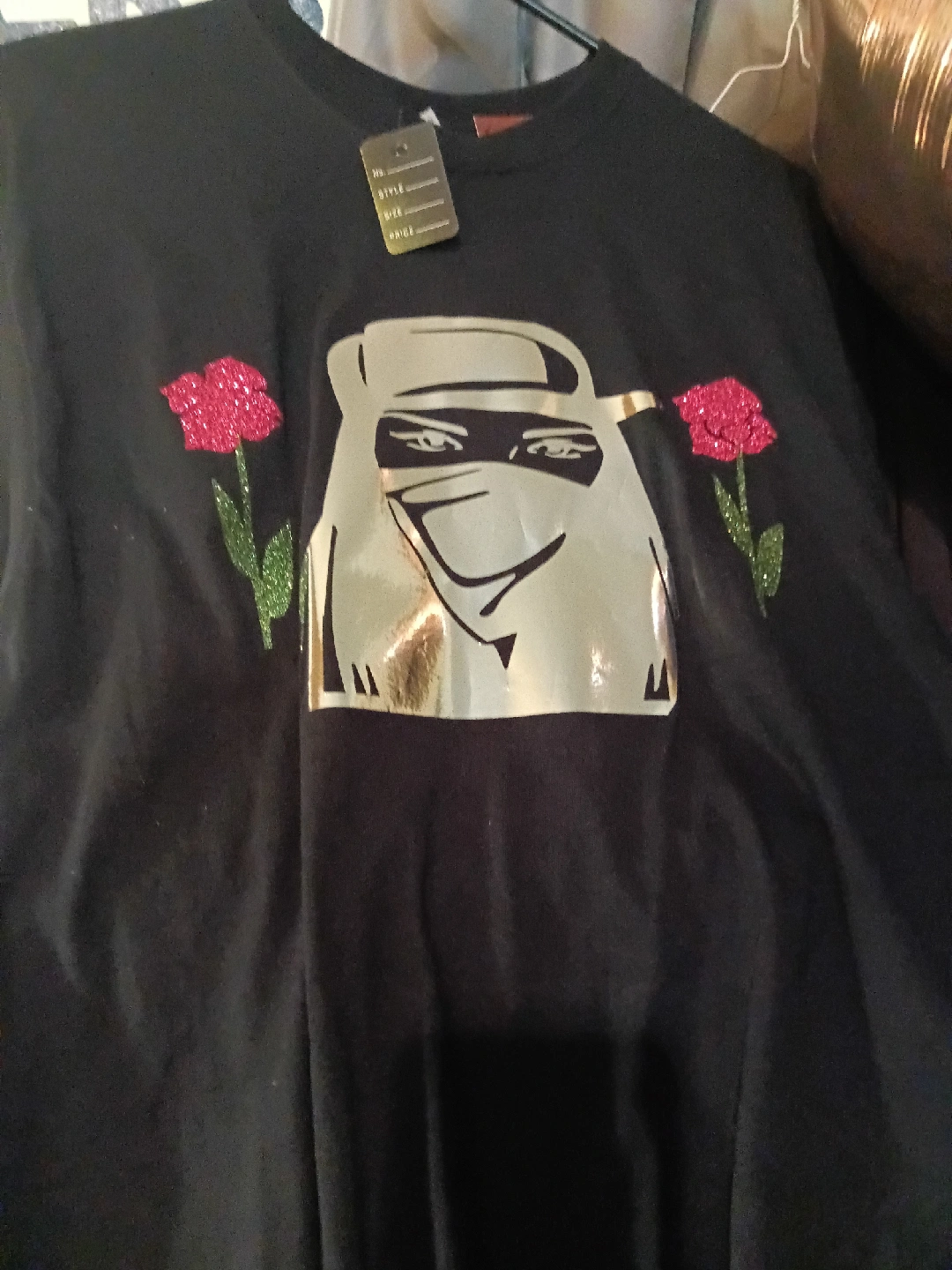10I'm selling a black t-shirt with a unique graphic design. It features a silver-colored design of a woman and two red roses. The tag is still attached, so it's in great condition!