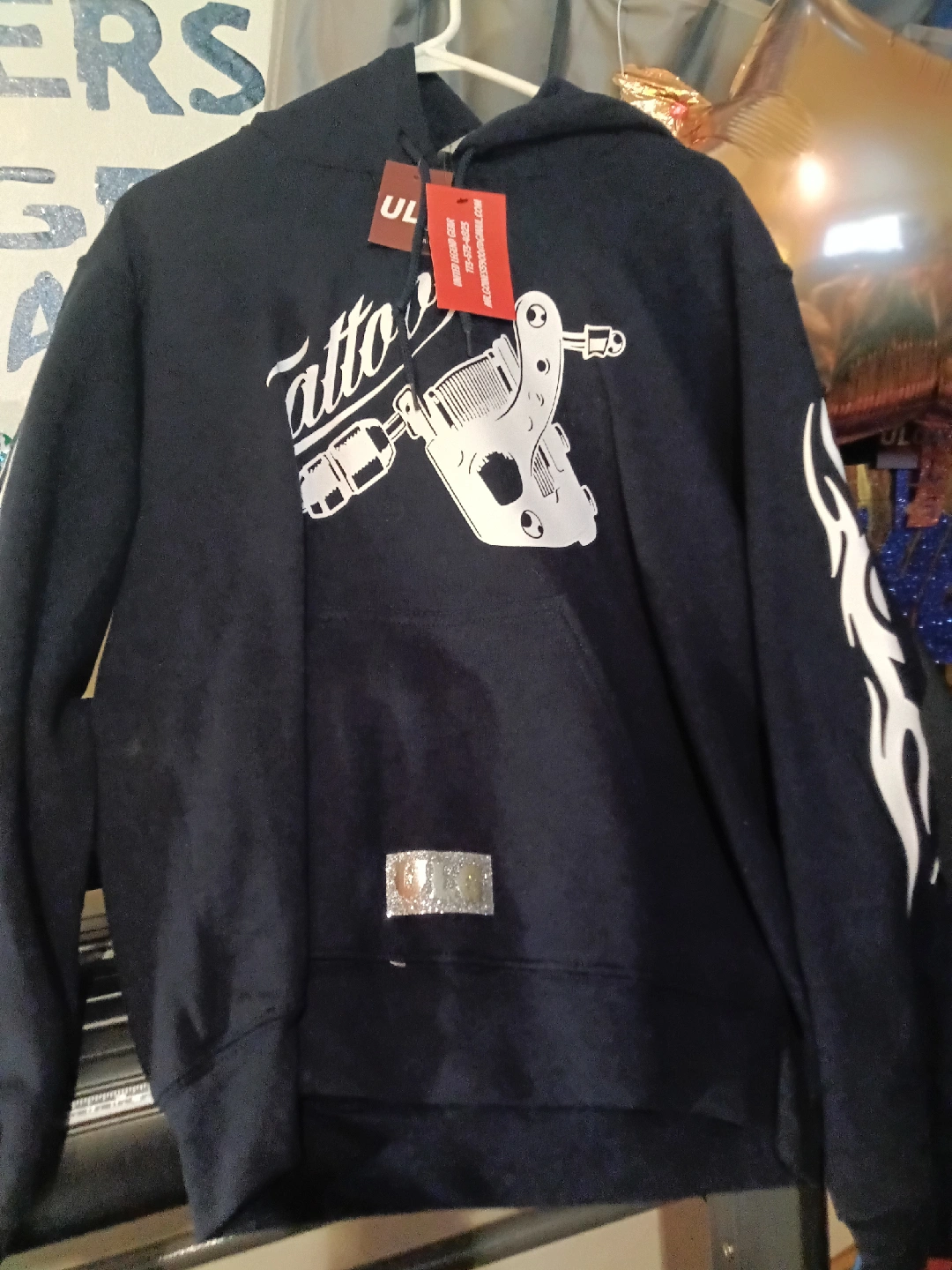 I'm selling a navy black hoodie with a tattoo gun graphic on the front. It also has flame designs on the sleeves. The hoodie is in great condition and ready for a new home!