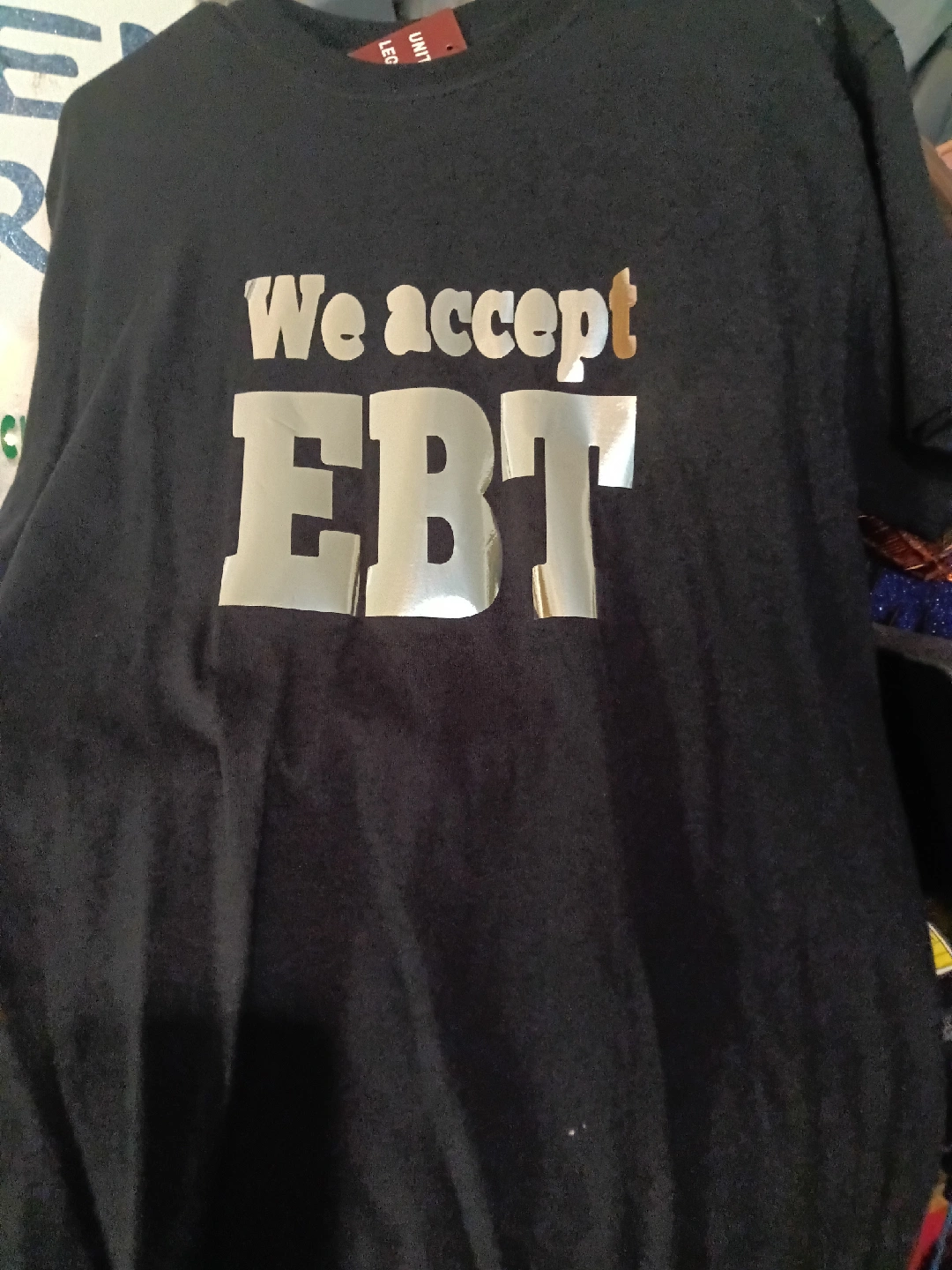 10Black t-shirt with "We accept EBT" printed on the front. It's in good condition and ready for a new home