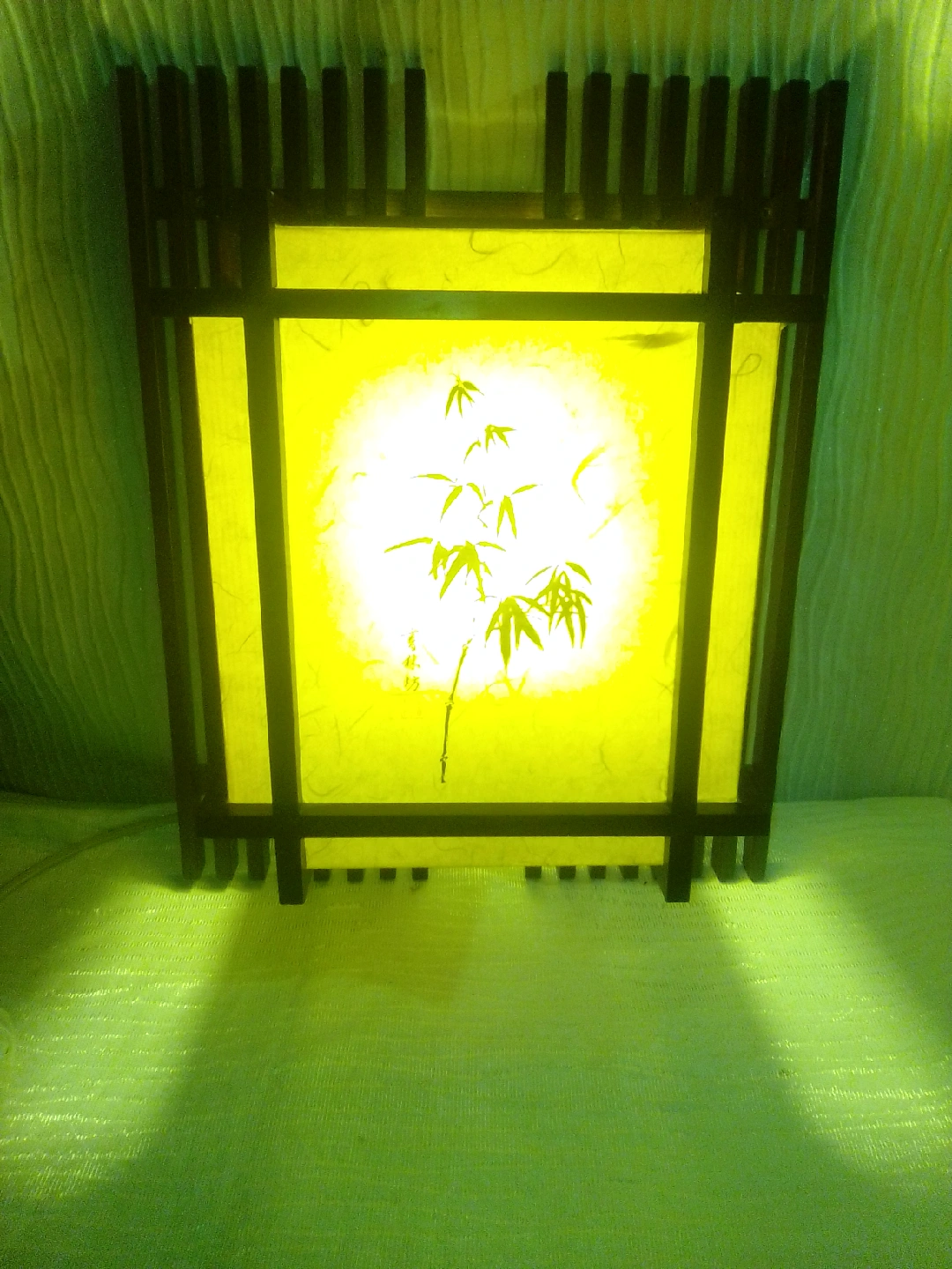 335This is a lovely Asian-inspired accent lamp! It features a bamboo design on the shade and a dark wood frame. It gives off a soft, warm light that's perfect for creating a relaxing atmosphere in any room