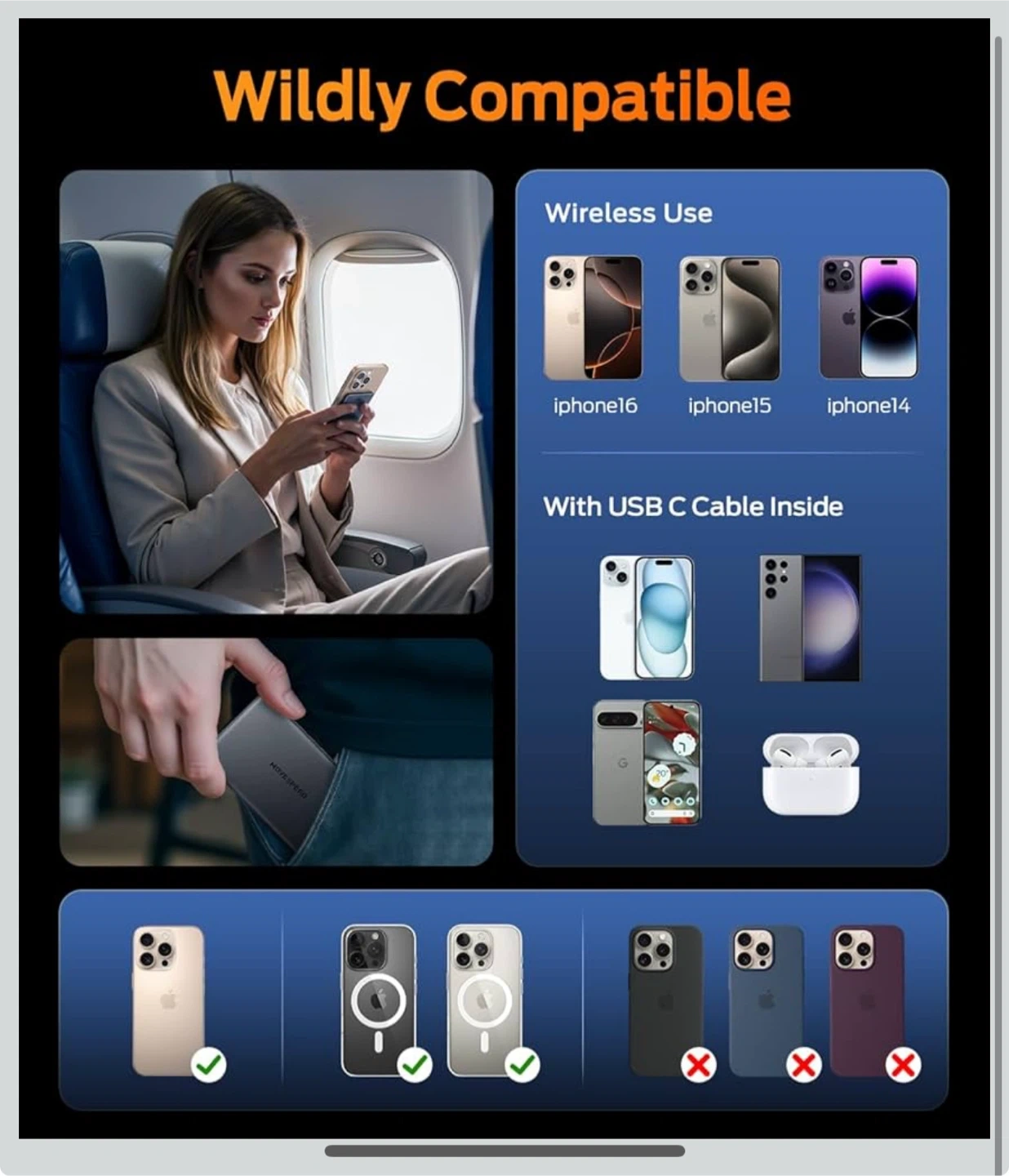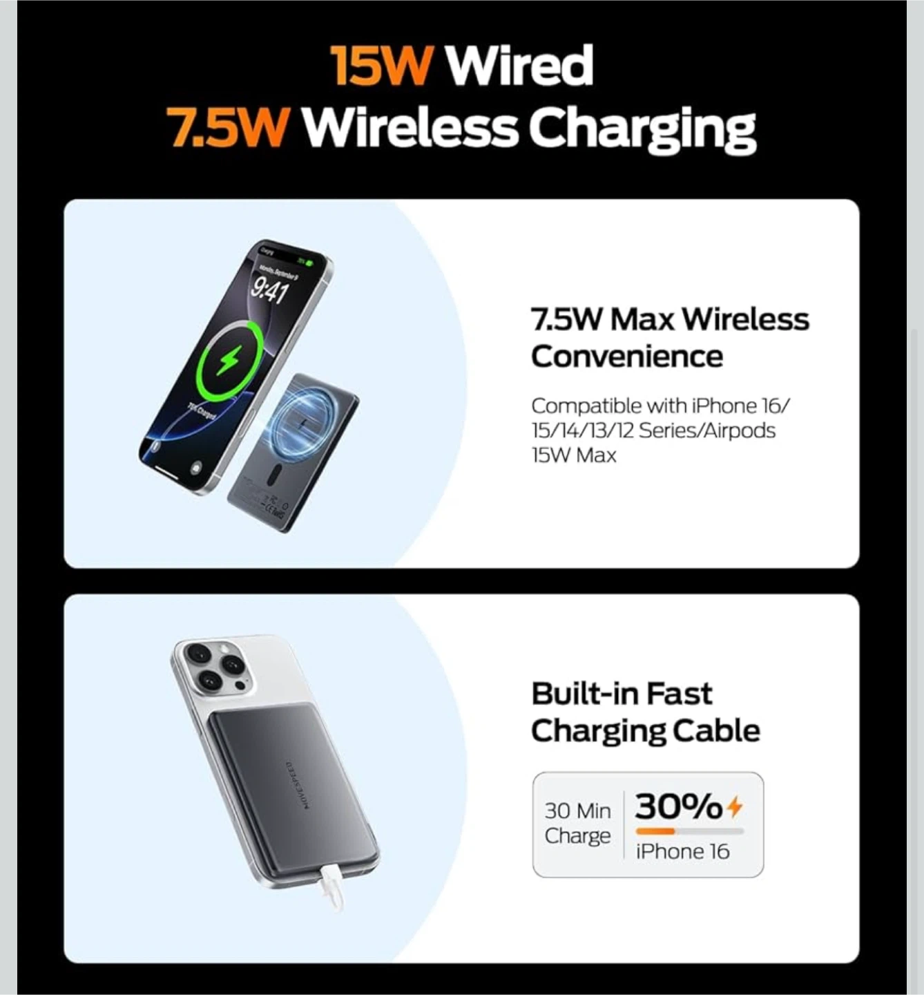 1540.3'' Ultra Slim MagSafe Portable Charger, Dual Use 2025 Upgrade 5,000mAh Battery Pack, Magnetic Power Bank with USB C Cable for iPhone 16/15/14/13/12, Silver Gray