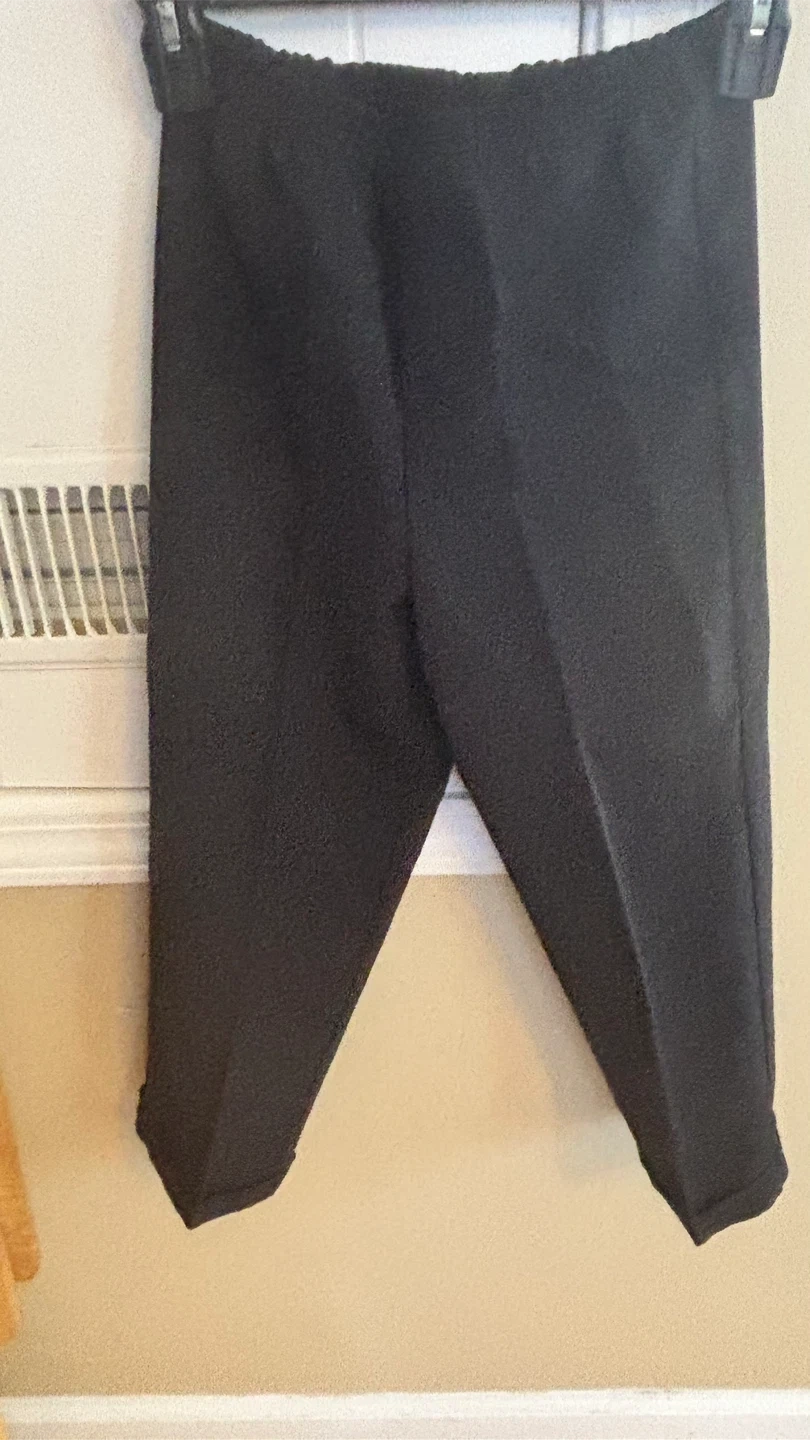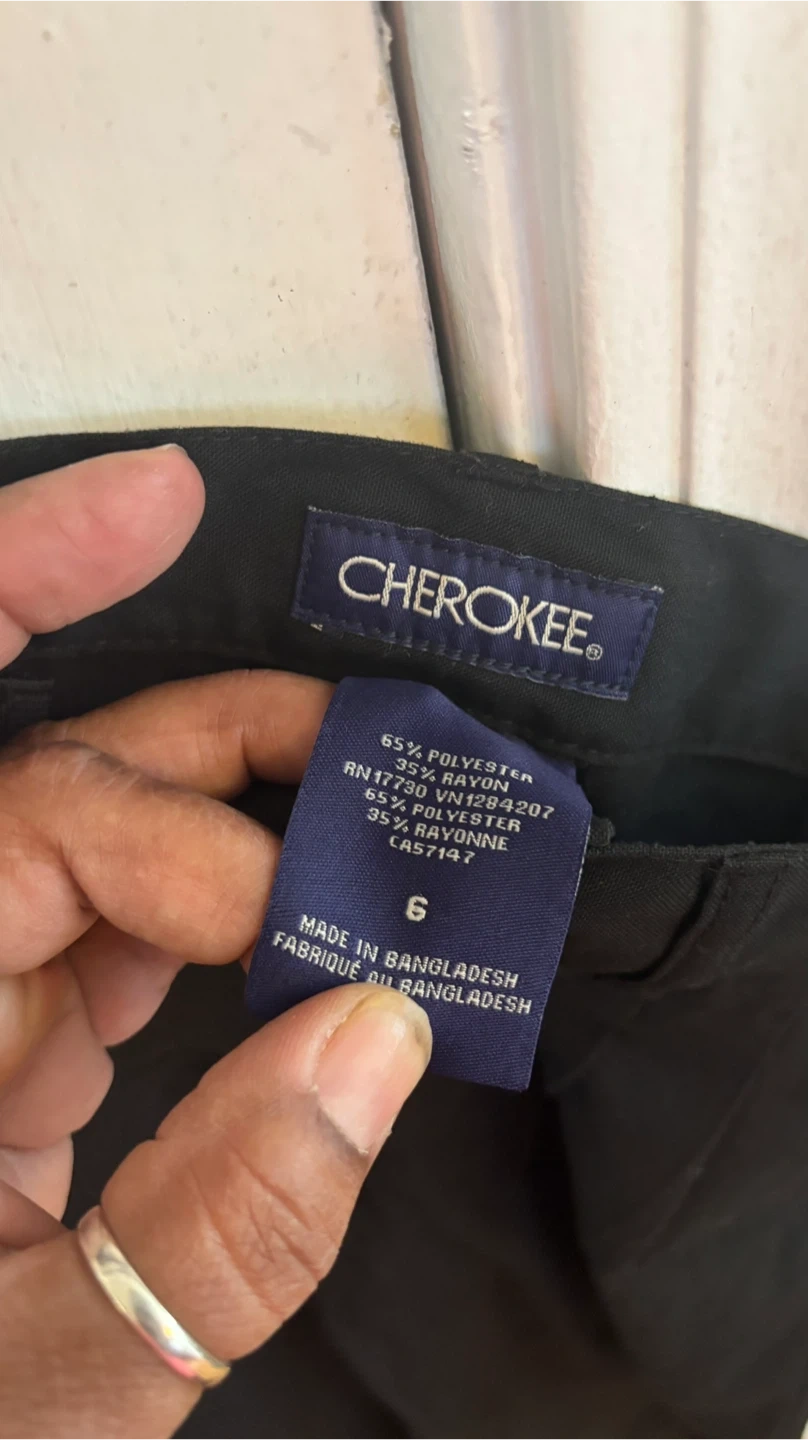 60Selling a pair of black pants from Cherokee in size 6! They're made of 65% polyester and 35% rayon. Perfect for school or casual wear. Along with the Cherokee pants are two additional black dressy / casual pants size 6. All three pairs of pants for $12 or $5 each.