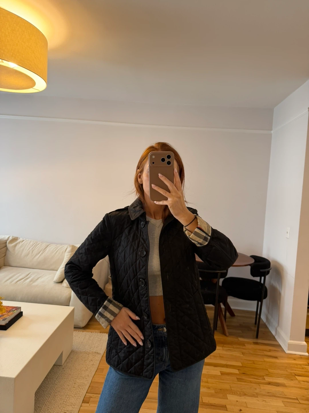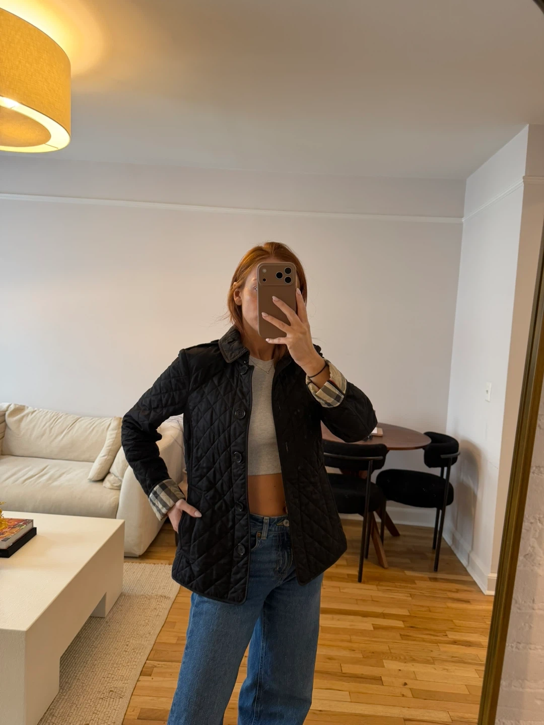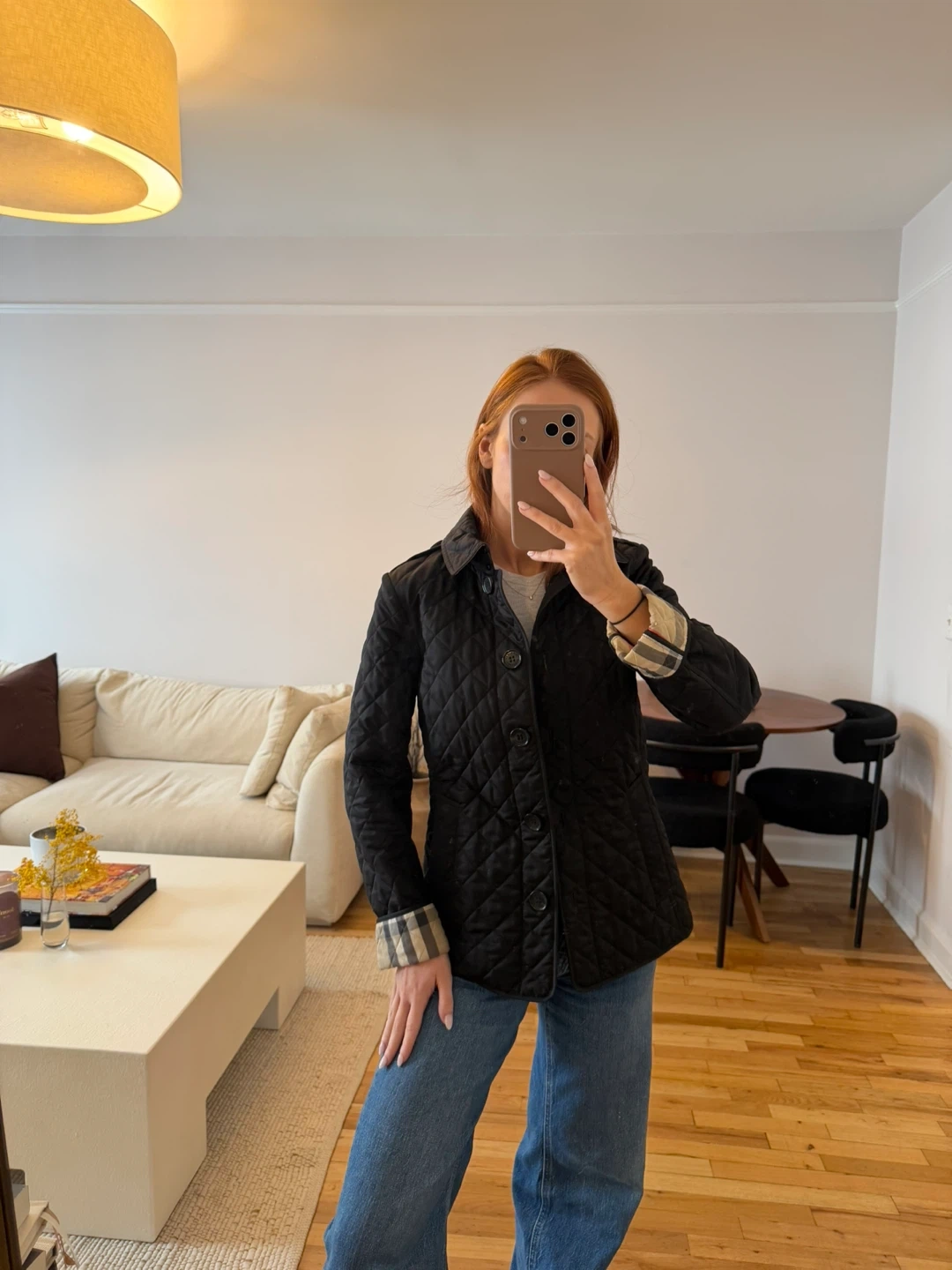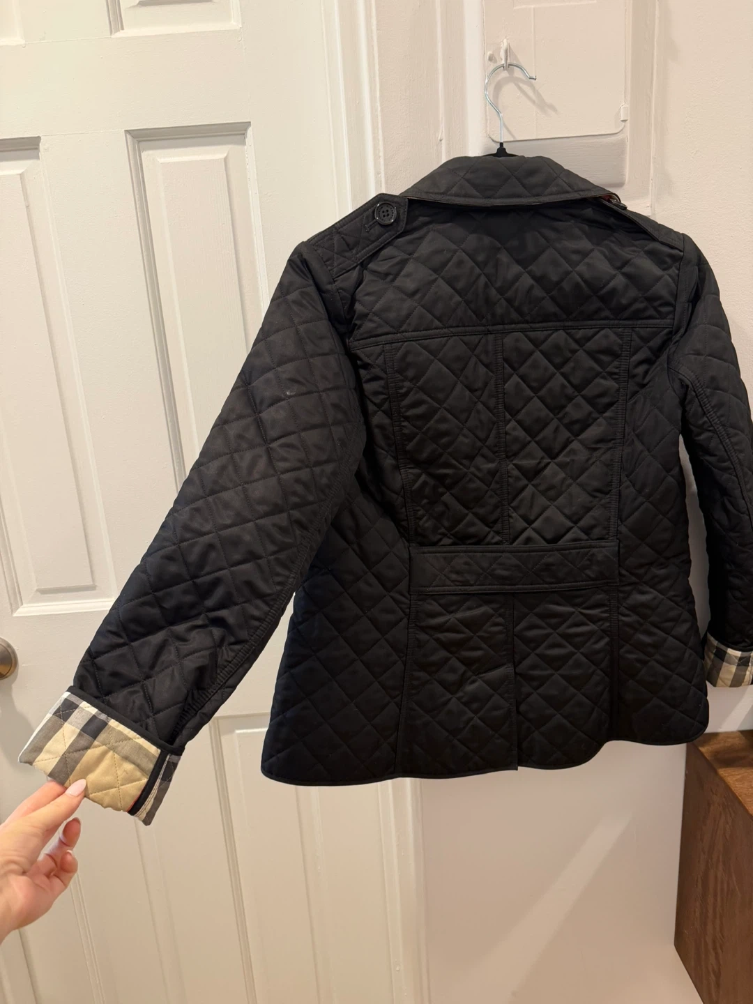 Selling a classic Burberry quilted jacket in black. It's a size XS and features the iconic Burberry check lining. Perfect for layering and adding a touch of sophistication to your wardrobe