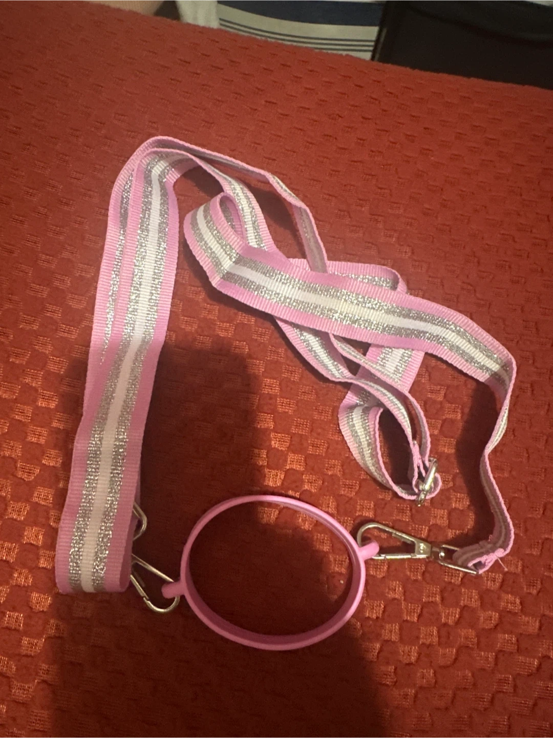 282Here's a cute pink and silver cup holder lanyard! It's perfect for holding your drink while you're on the go. The lanyard is made of a durable material and has a sturdy clip to keep your cup secure