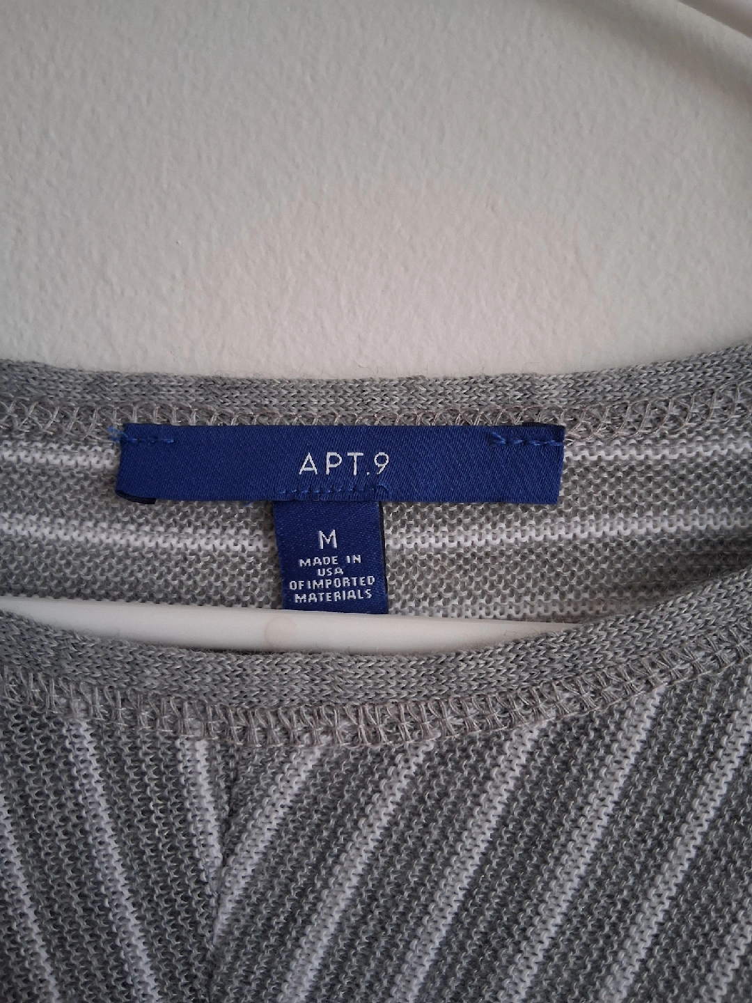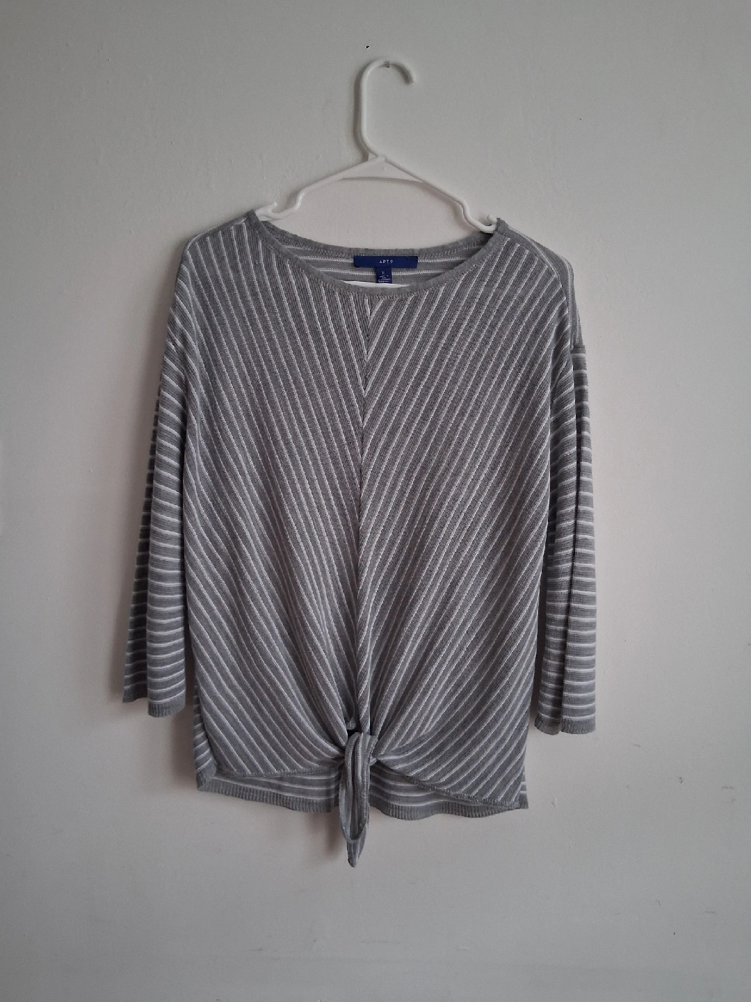 60Selling an APT. 9 top in size medium! It features a stylish striped pattern and a cute tie-front detail. The material feels comfortable and lightweight, perfect for casual wear. It's in great condition and ready for a new home!