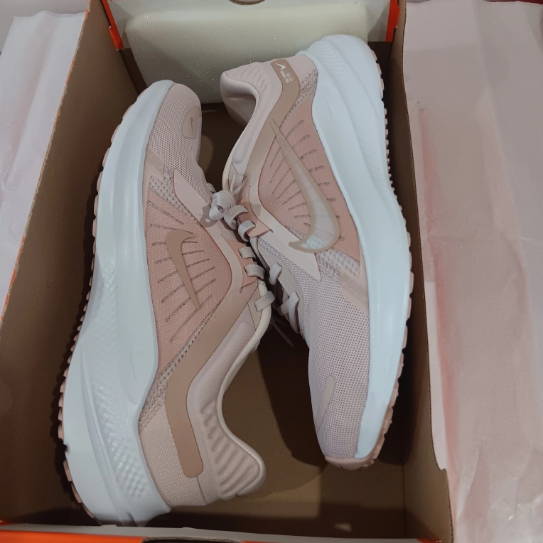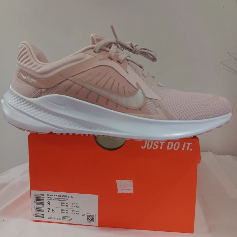 60The box does not have the lid. Selling a pair of Nike Quest 5 women's running shoes in size 9. They come in a nice, neutral pink color with white soles. The shoes are in great condition and include the original box!