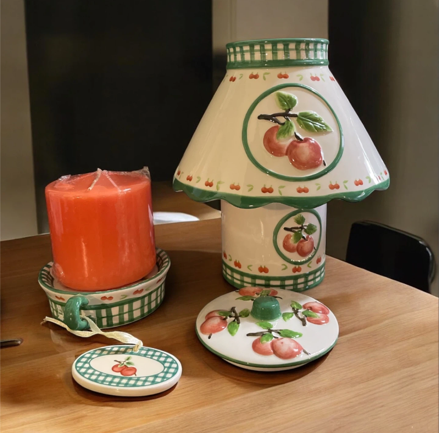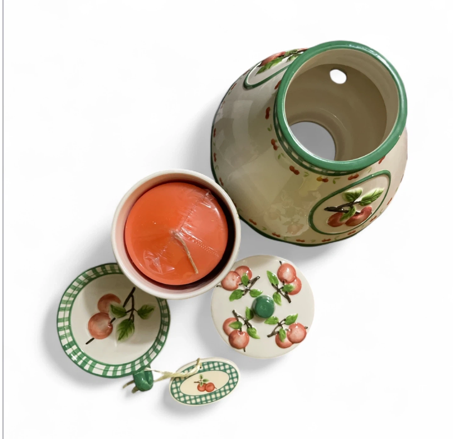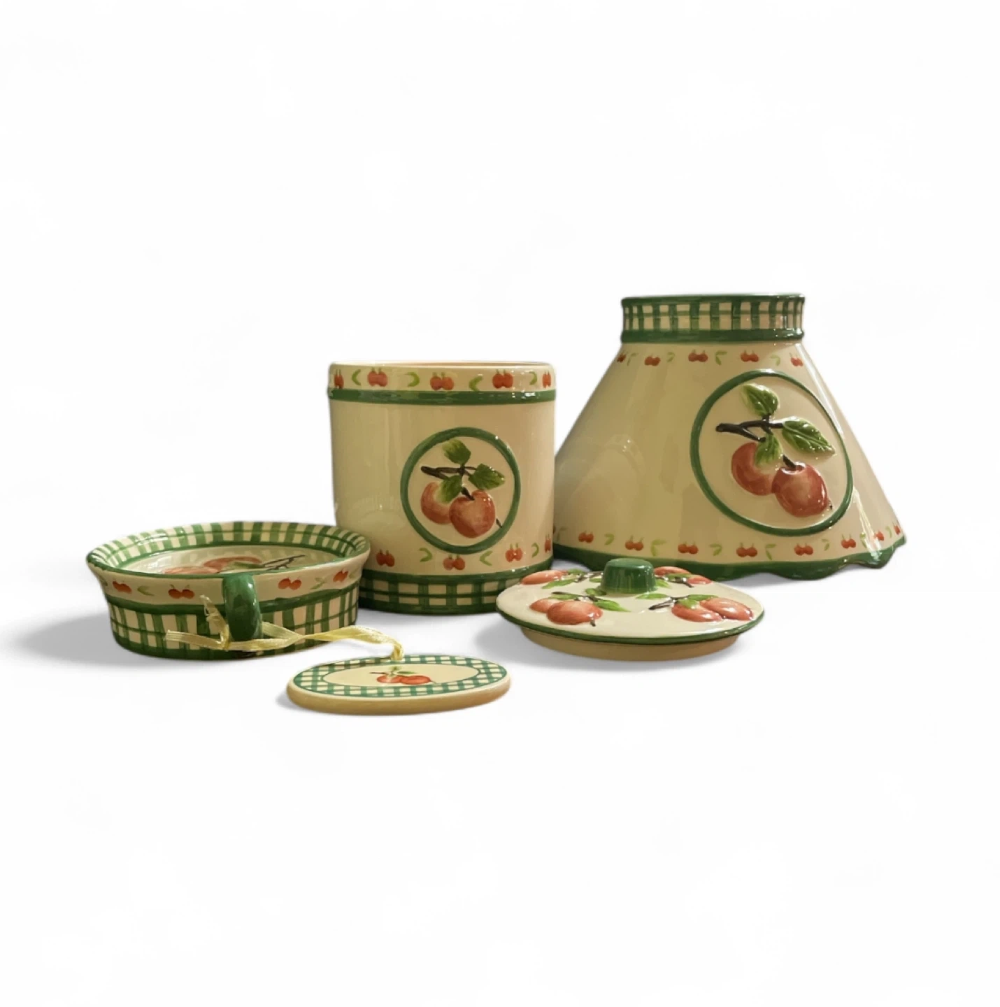 23This set includes a canister with lid which also includes a unique lamp shade, candle holder and candle all adorned with apples design. The 6 pieces are new and includes the basket. Please note: the stripe clothing is not included.