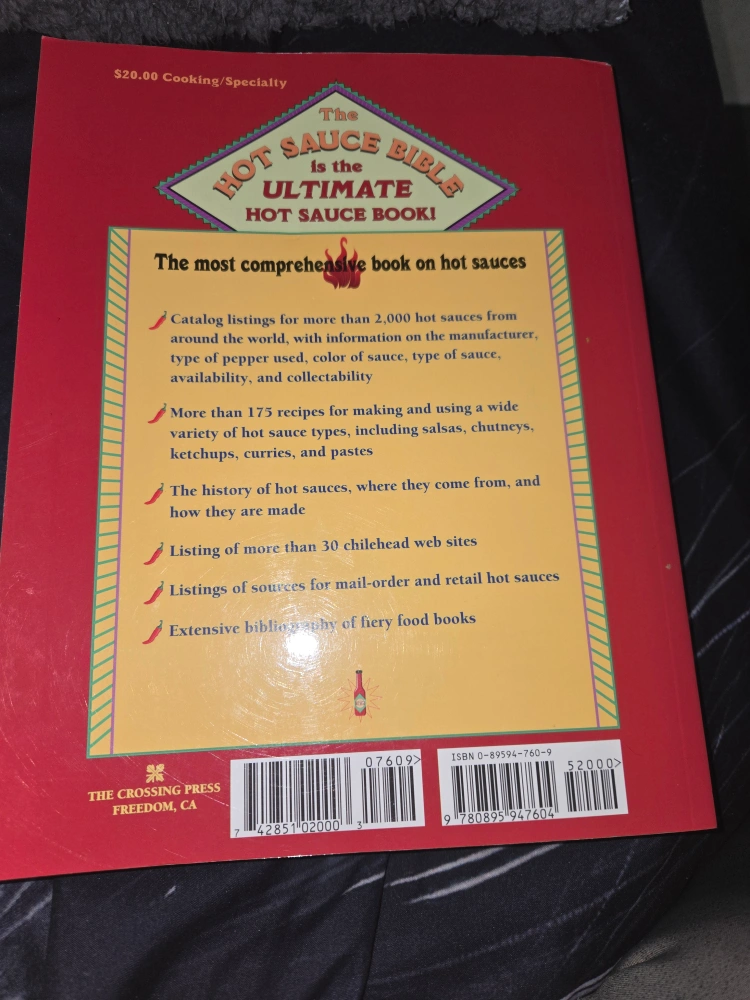 25Selling "The Hot Sauce Bible" by Dave DeWitt and Chuck Evans! It's the ultimate hot sauce book with catalog listings for over 2,000 hot sauces from around the world. You'll find information on the manufacturer, type of pepper used, color of sauce, type of sauce, availability, and collectability. It also includes more than 173 recipes for making and using a wide variety of hot sauce types, including salsas, chutneys, ketchups, curries, and pastes pick up in the Town of Newburgh NY by Aldi's