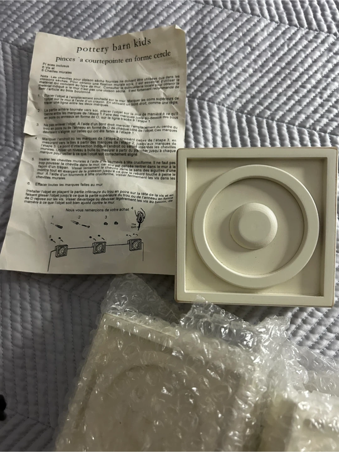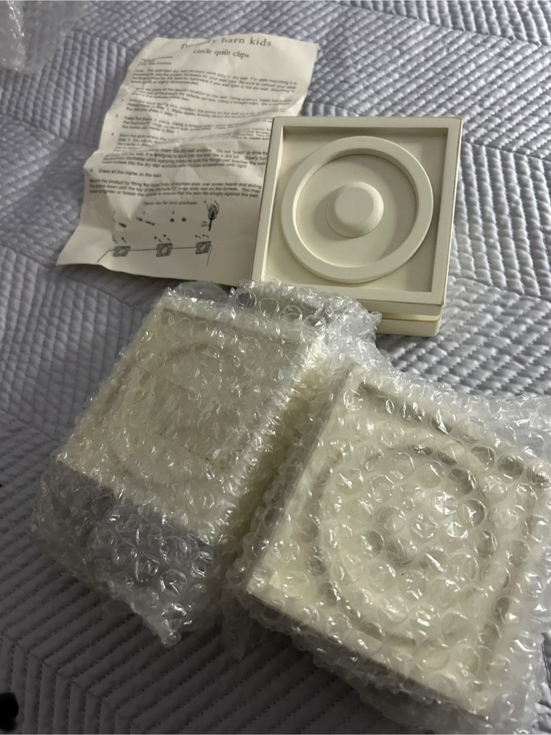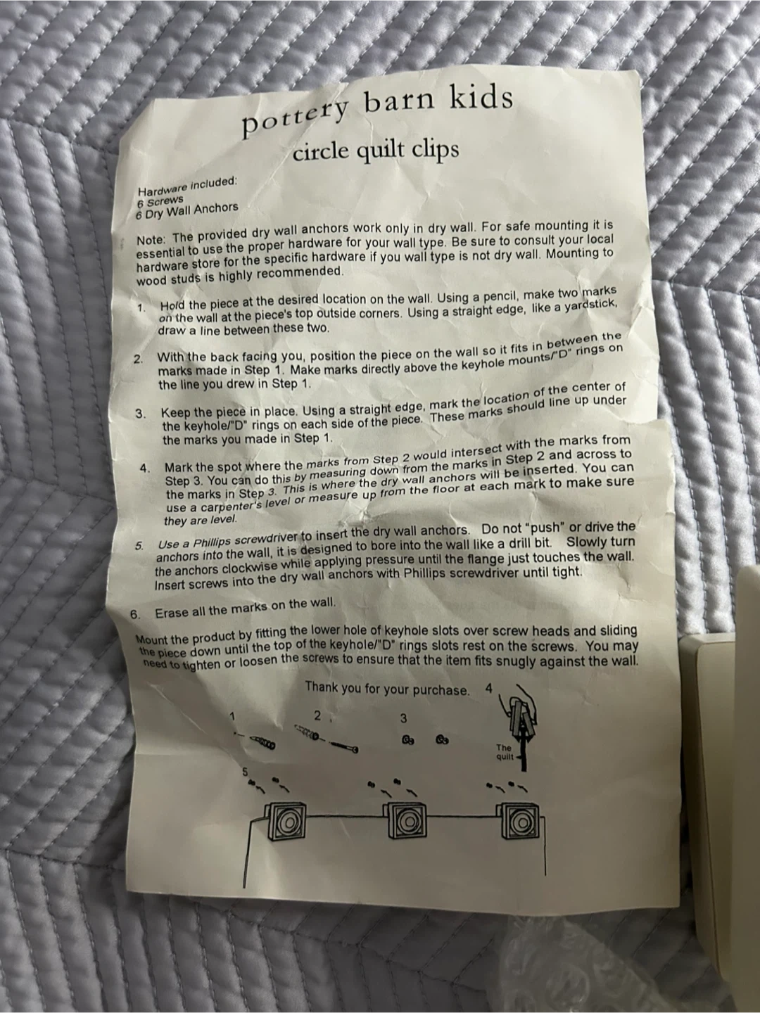 18Selling a set of three (3) Pottery Barn Kids Circle Quilt Clips! These are perfect for hanging quilts or other decorative items. They come with the original instructions and hardware, including screws and dry wall anchors. They are in excellent condition and ready to use in your home Won’t find it for less. Cash only - pick up in brooklyn Was Asking set of 3 for $17.00. REDUCED ONLY now $15.00