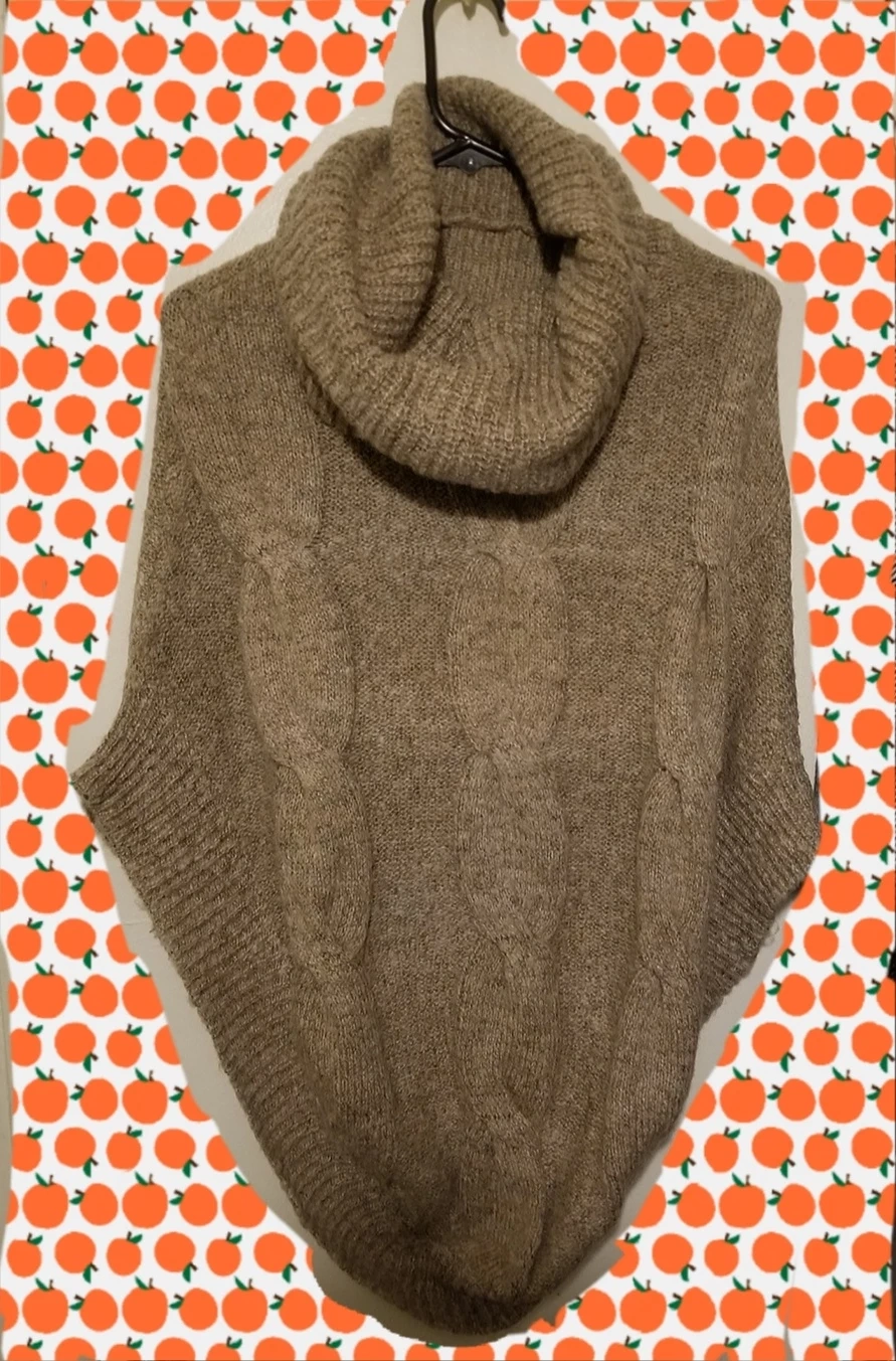 Here's a cozy Mocha brown ribbed knit poncho! It features a stylish turtleneck design and a comfortable, relaxed fit. Perfect for layering during cooler weather. The knitted texture adds a touch of warmth and sophistication to any outfit. Never Worn.