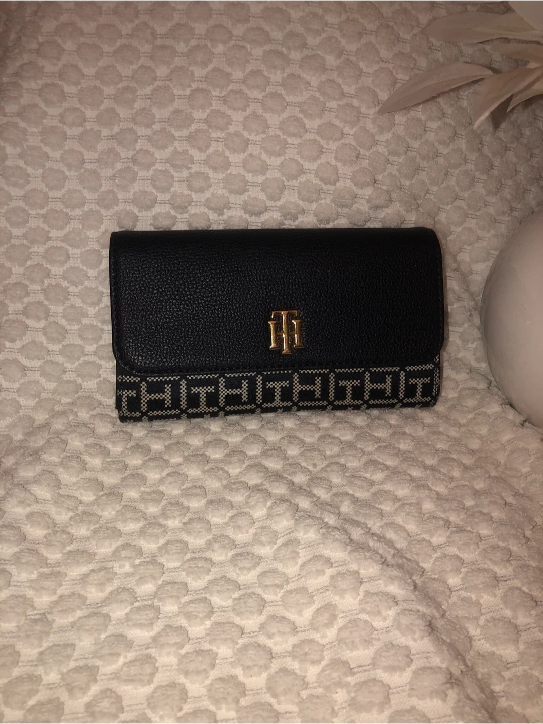 15Selling a cute Tommy Hilfiger wallet! It's black with a patterned design on the bottom. It has a gold-tone logo. Perfect for keeping your cards and cash organized!
