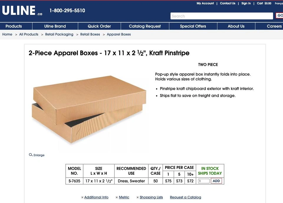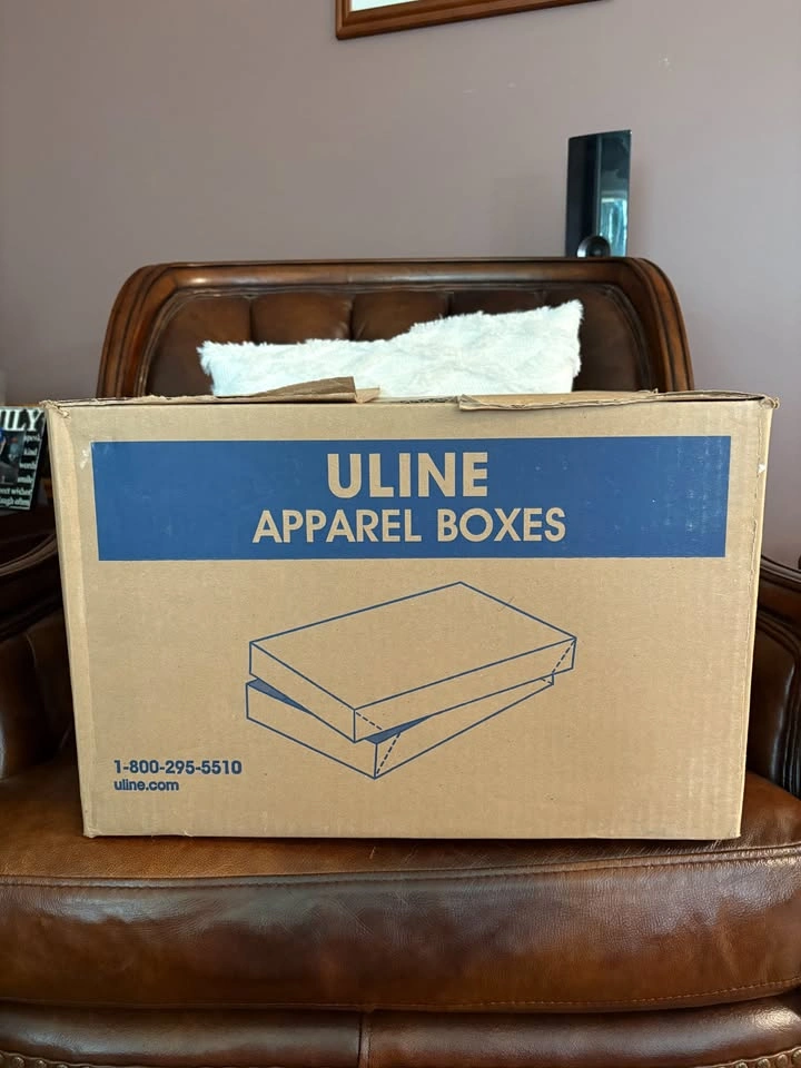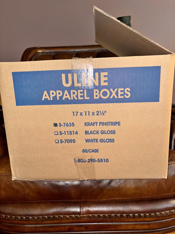 ULINE Kraft Pinstripe 2-Piece Apparel Boxes. Case originally had 50 in it, less than 1/4 missing. Retails $75 for the box. Asking $45 OBO.