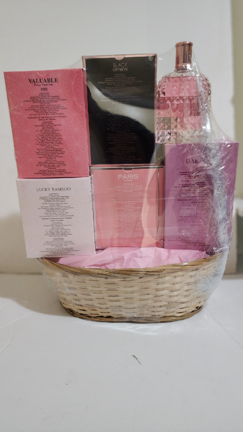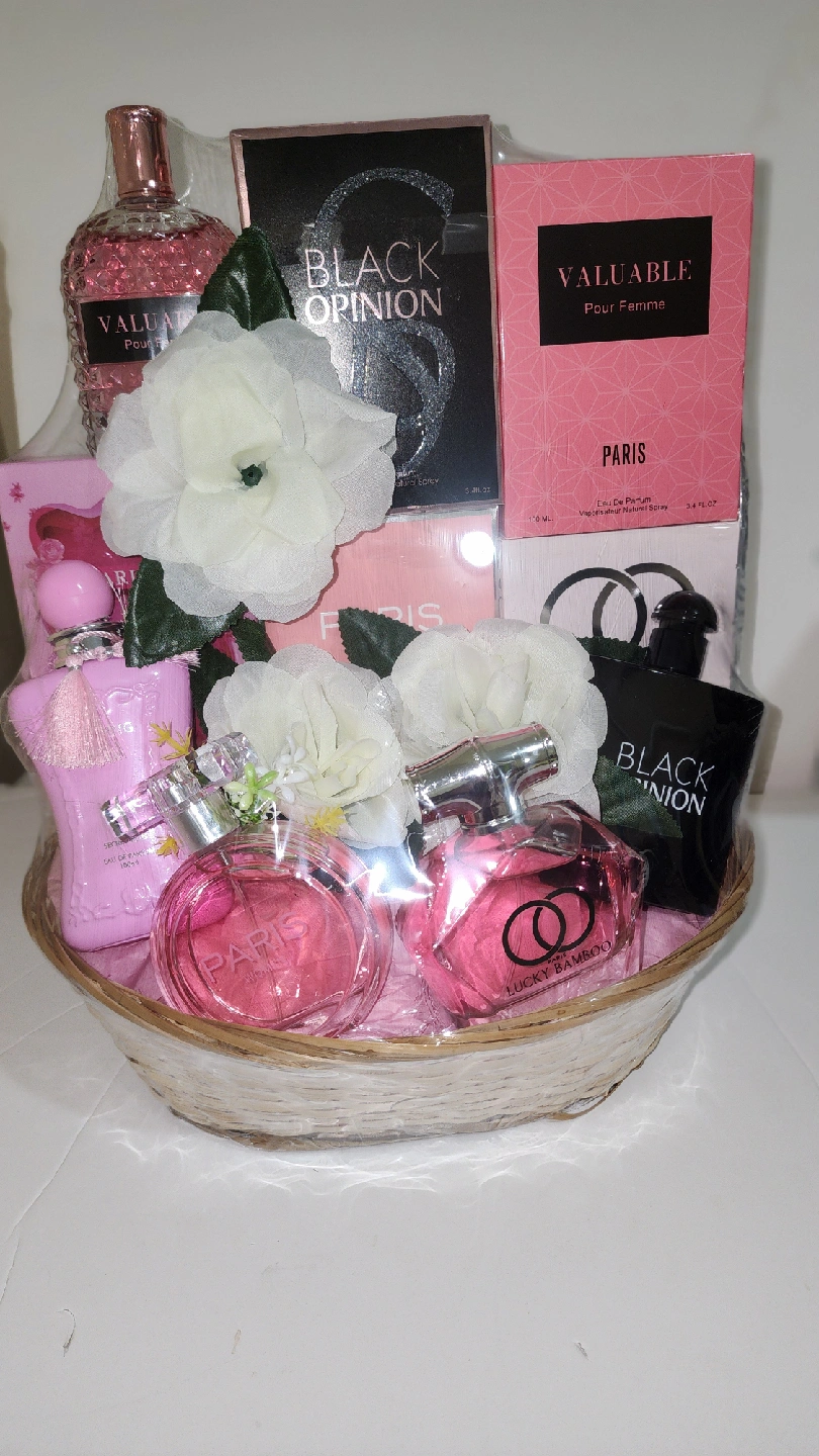 12Selling a beautiful perfume gift basket that includes a variety of scents! -Darling -Paris women -Lucky Bamboo -Black Opinion -Valuable Perfect for gifting or treating yourself to a new fragrance collection