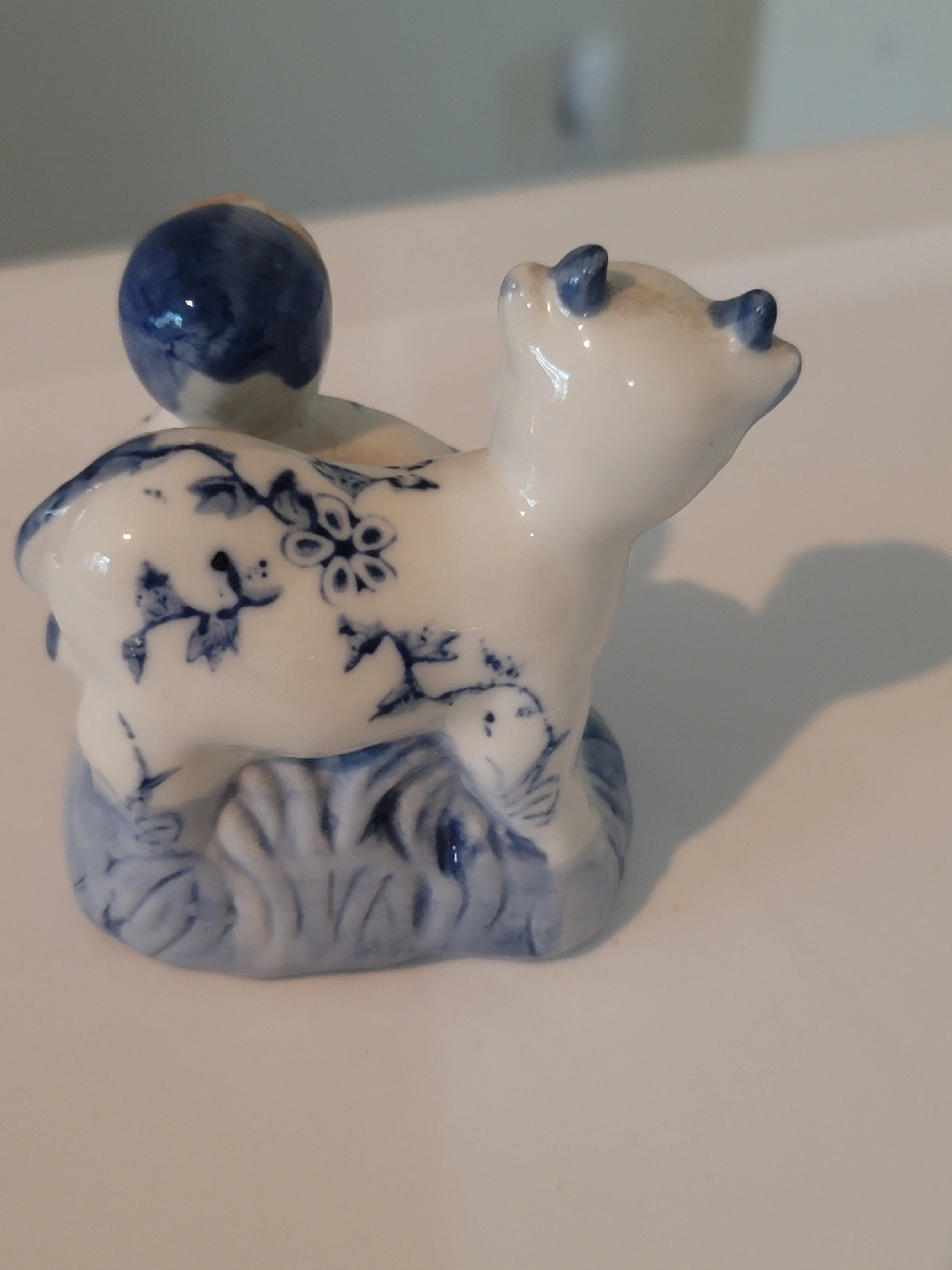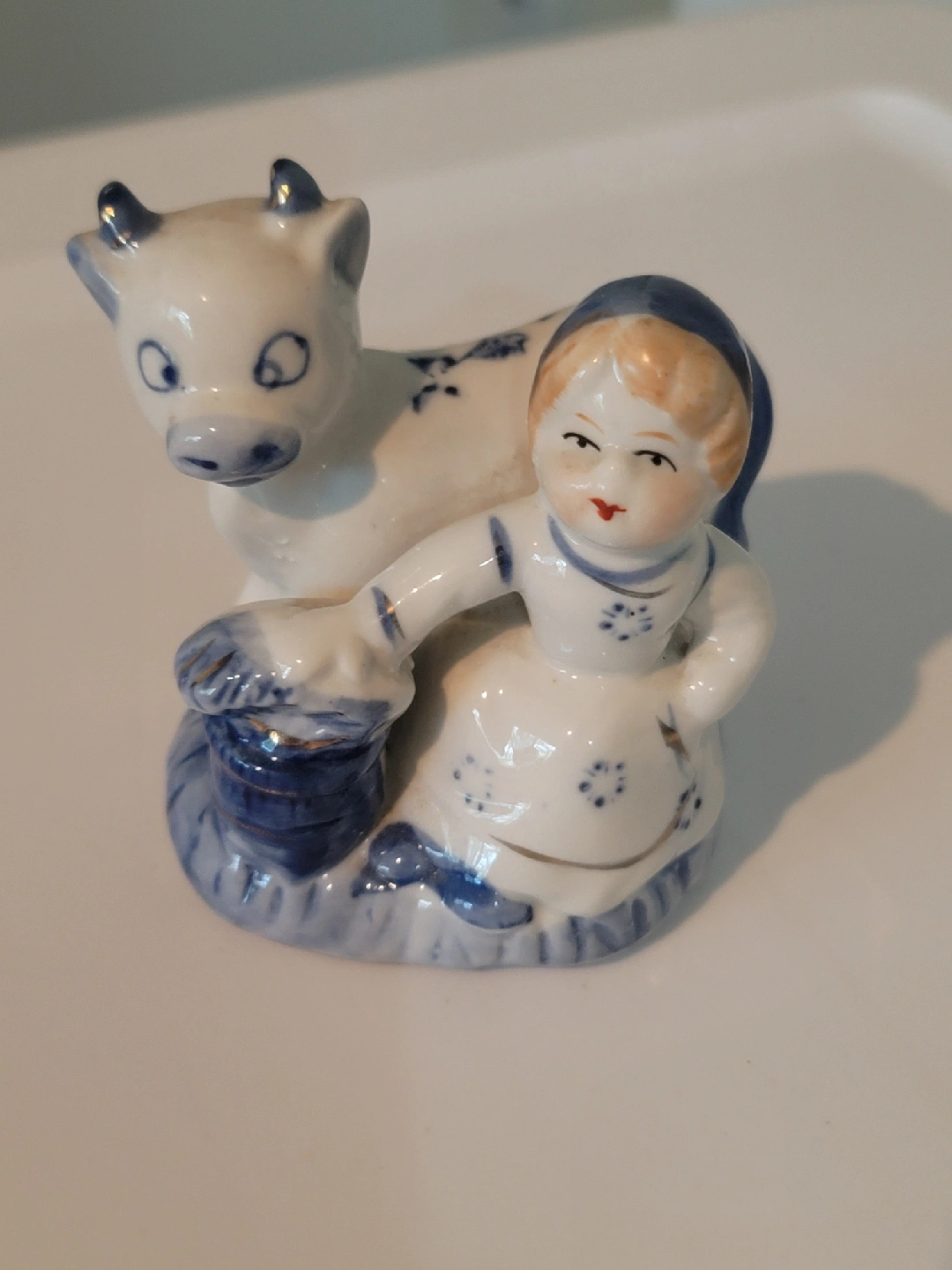 18vintage ceramic figurine featuring a girl with a cow. It's a charming piece with blue and white details, perfect for collectors or as a decorative item. The figurine has a unique design and a classic look that would add a touch of vintage charm to any space pick up in Merrick Ny CASH ONLY