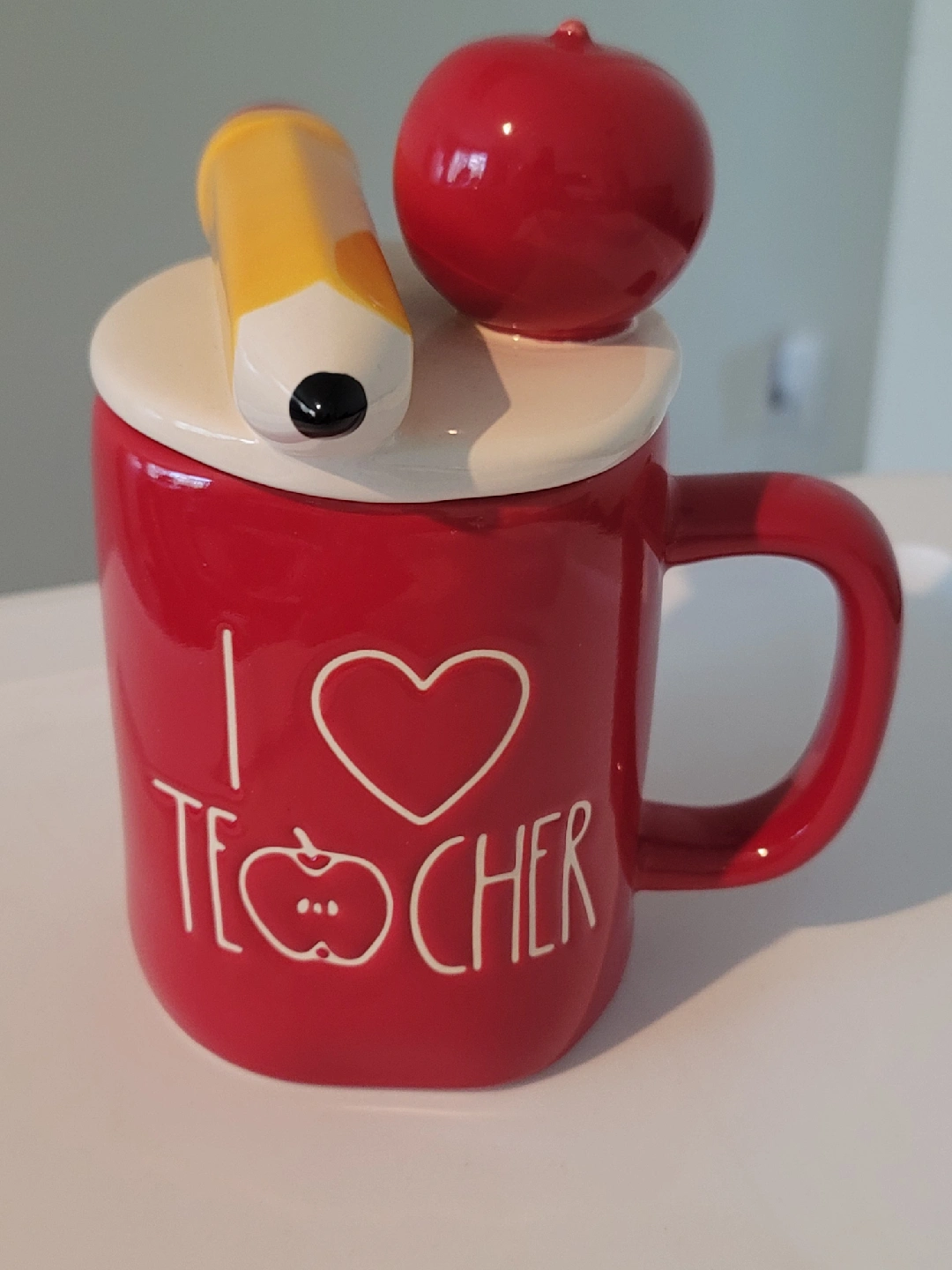18Rae Dunn Artisan Collection mug by Magenta. It's red and says "I Heart Teacher" with an apple design. The lid has a pencil and apple on top. It is microwave and dishwasher safe pick up in Merrick Ny CASH ONLY