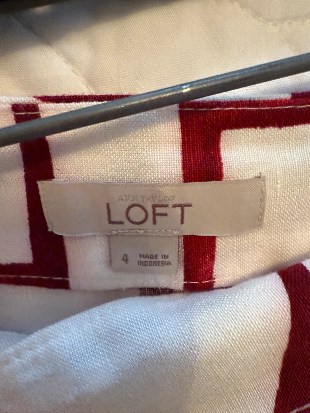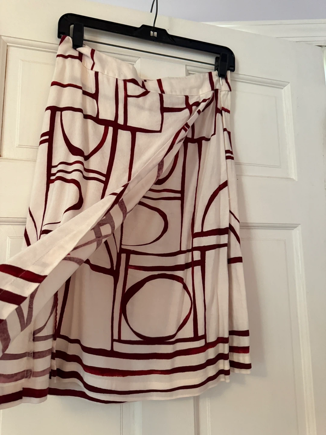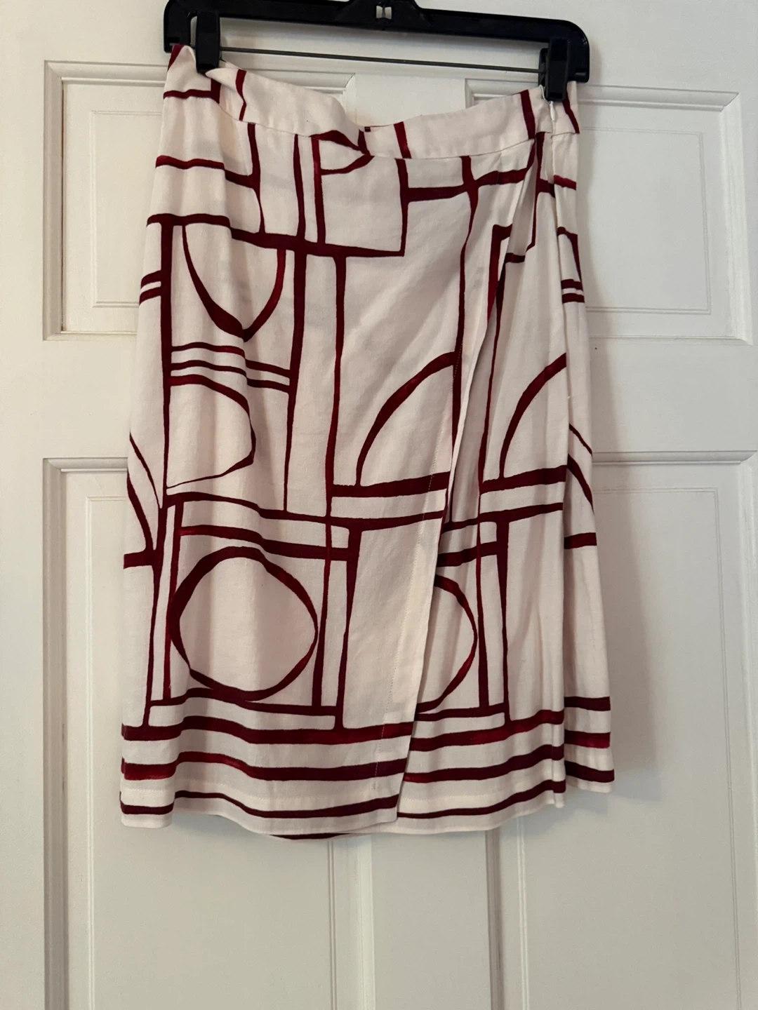 211Selling a LOFT wrap skirt in size 4. It features a unique geometric pattern in red on a white background. Perfect for adding a touch of style to your wardrobe!