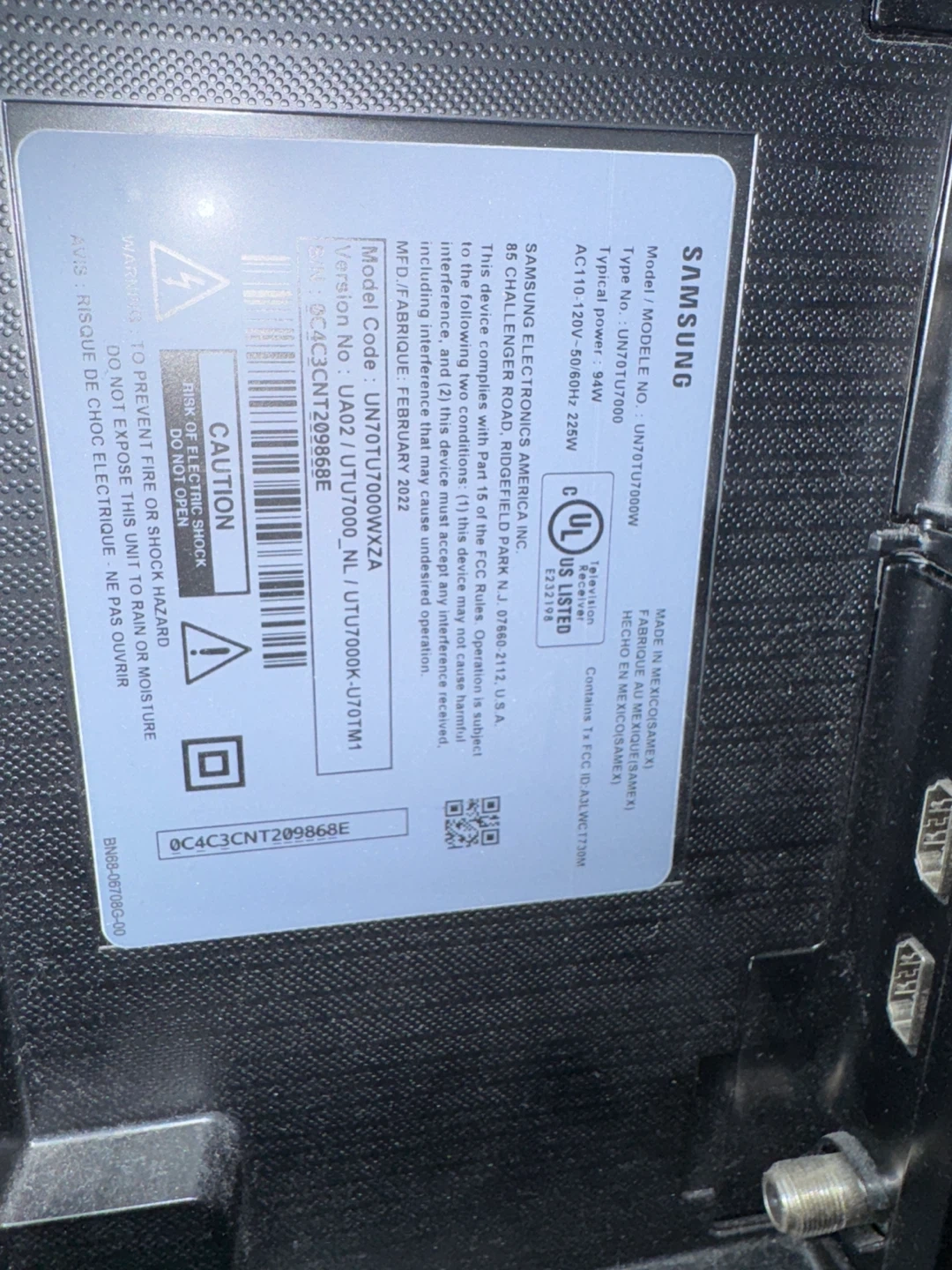 65Selling a Samsung 70-inch 4K UHD Smart TV, model number UN70TU7000WXZA. Key details: - Model: UN70TU7000 - Screen Size: 70 inch - 4K UHD Feel free to reach out if you're interested!