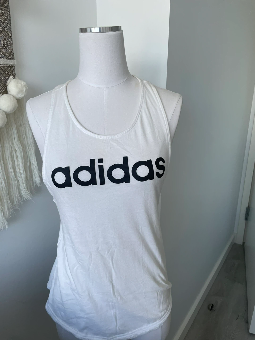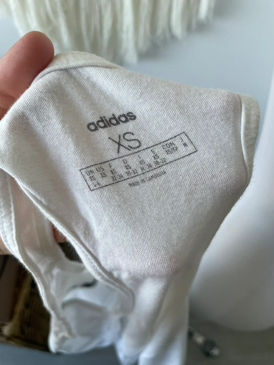Selling a white Adidas tank top in size XS. It's in great condition and ready for a new home! Perfect for workouts or casual wear. The material is lightweight and breathable, making it super comfy for any activity