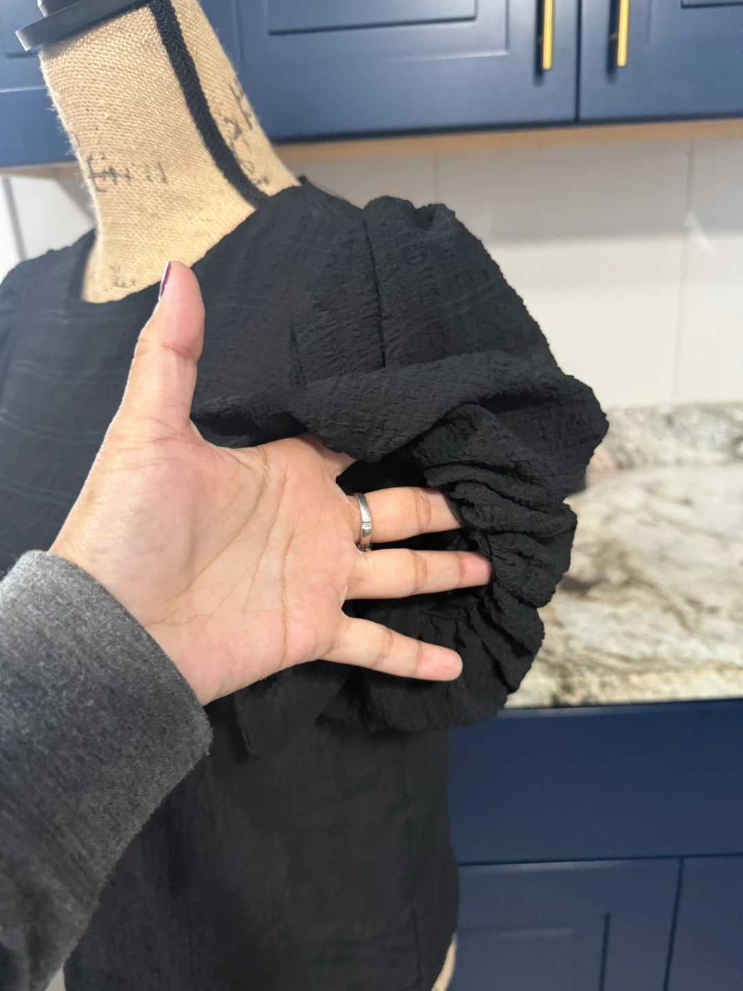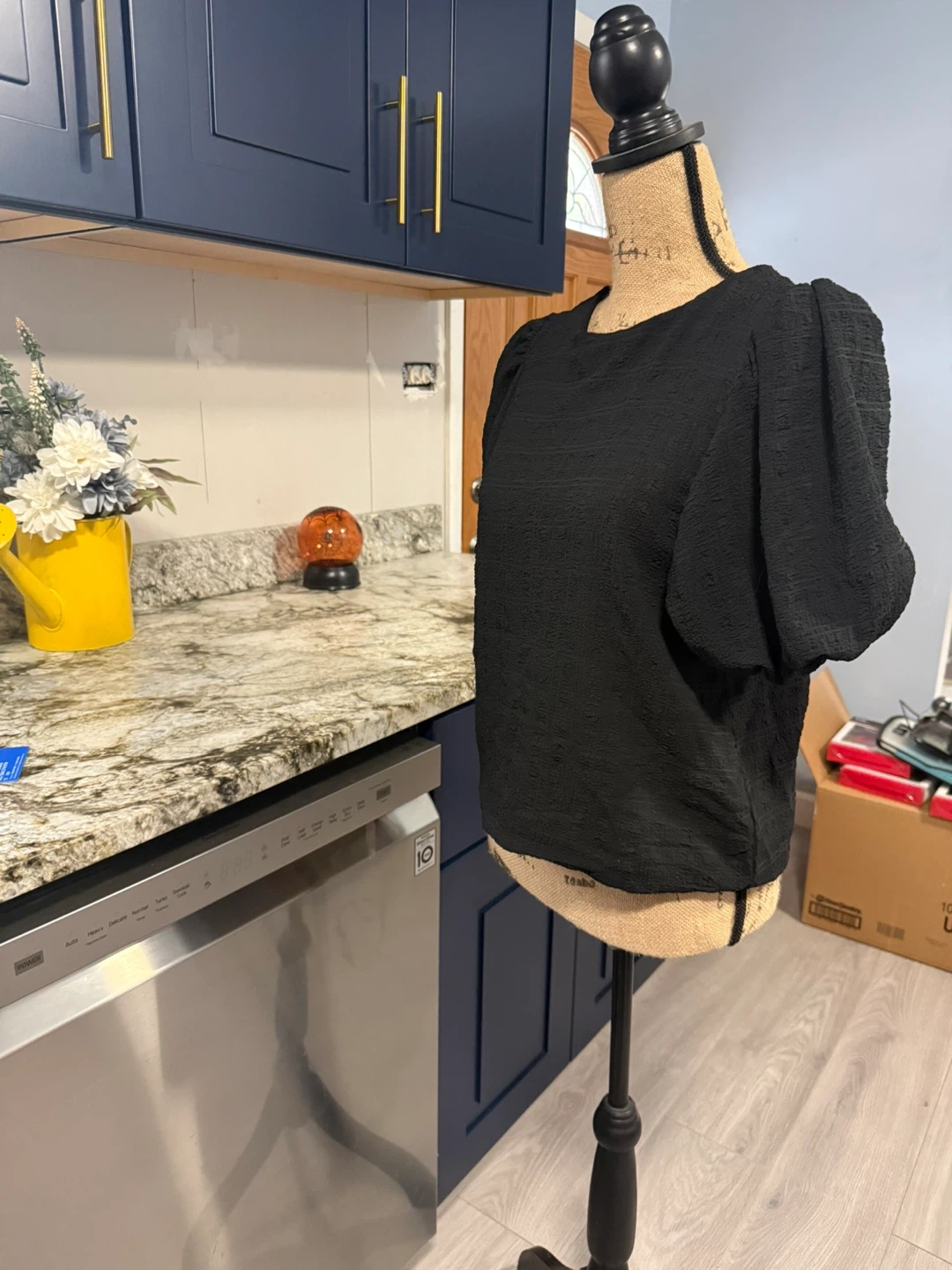 Here's a stylish black top with puff sleeves! It's in great condition and ready for a new home. The fabric has a subtle texture that adds a touch of elegance to the design. Perfect for dressing up or down!