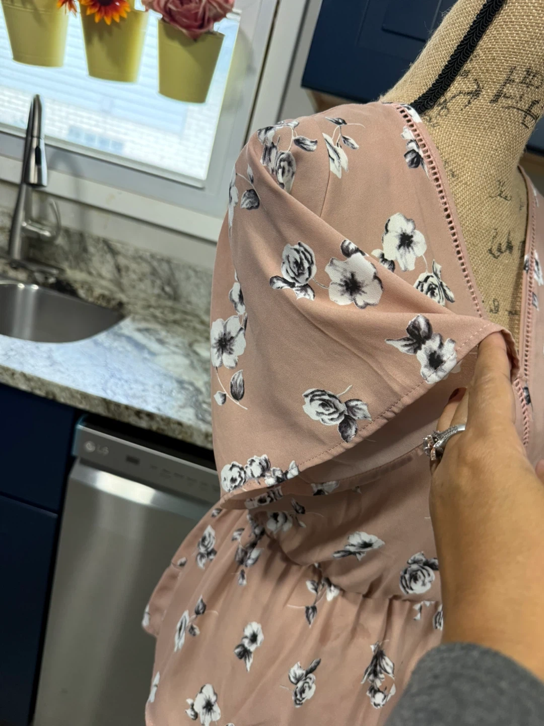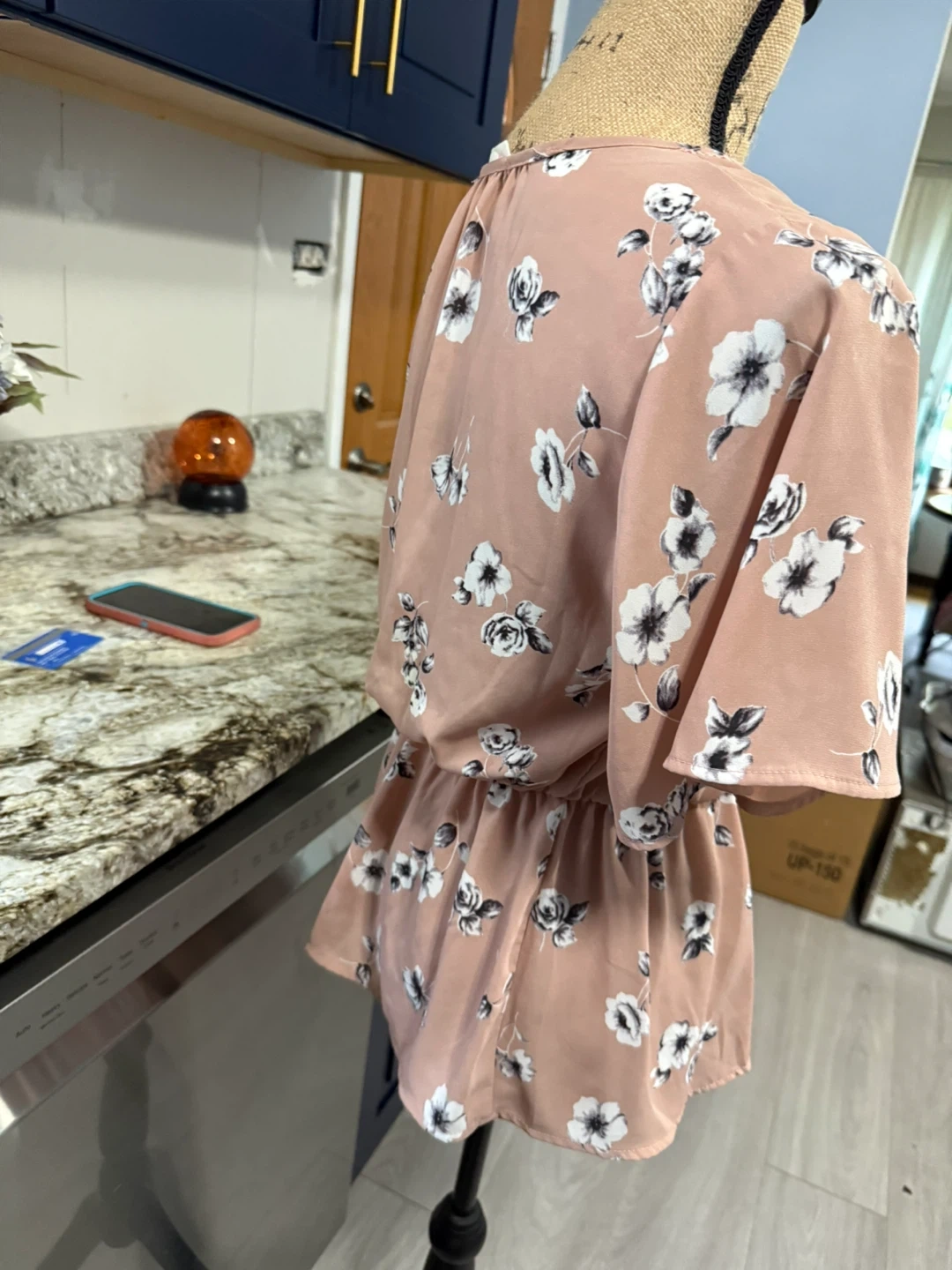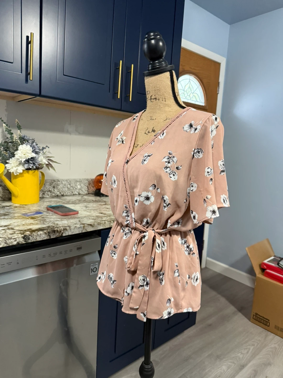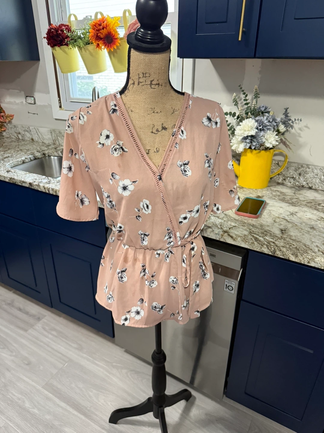 A cute and stylish floral print wrap blouse! It's a size M and features a flattering wrap design with a tie at the waist. The light pink color and floral pattern make it perfect for spring or summer