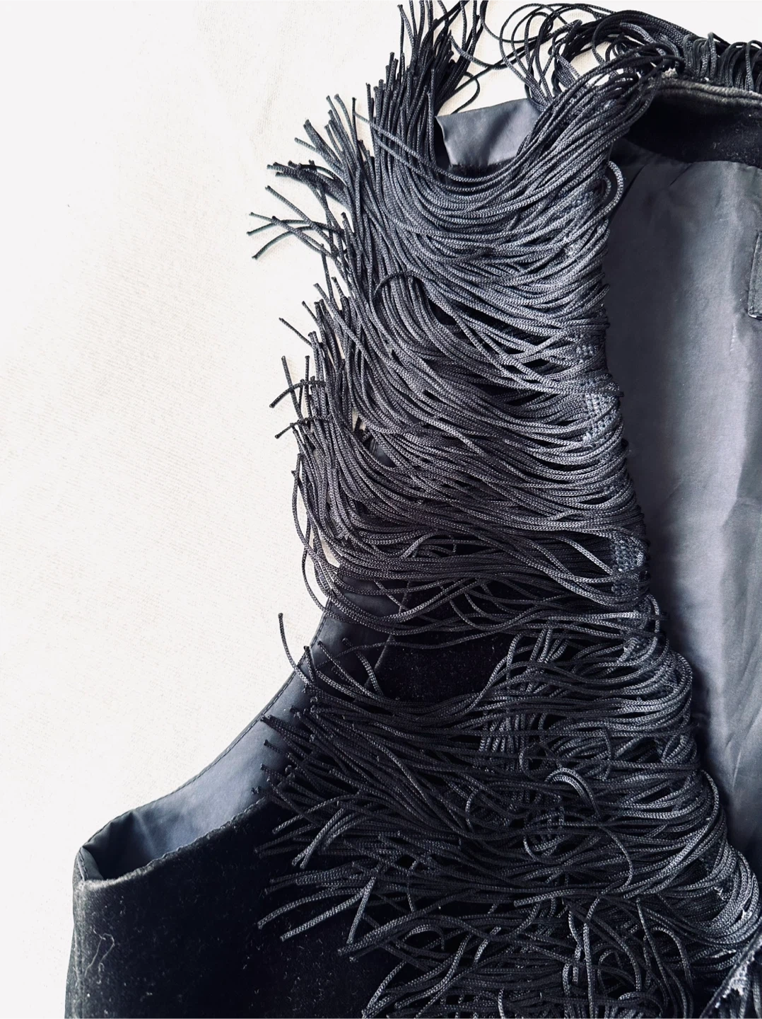 65Selling a stylish black velvet vest from H&M! It features a unique post production fringe detail that adds a fun touch to any outfit. This vest also features an adjustable waist for a little extra room or cinch. Perfect for layering or making a statement. The vest is in great condition and ready for a new home.