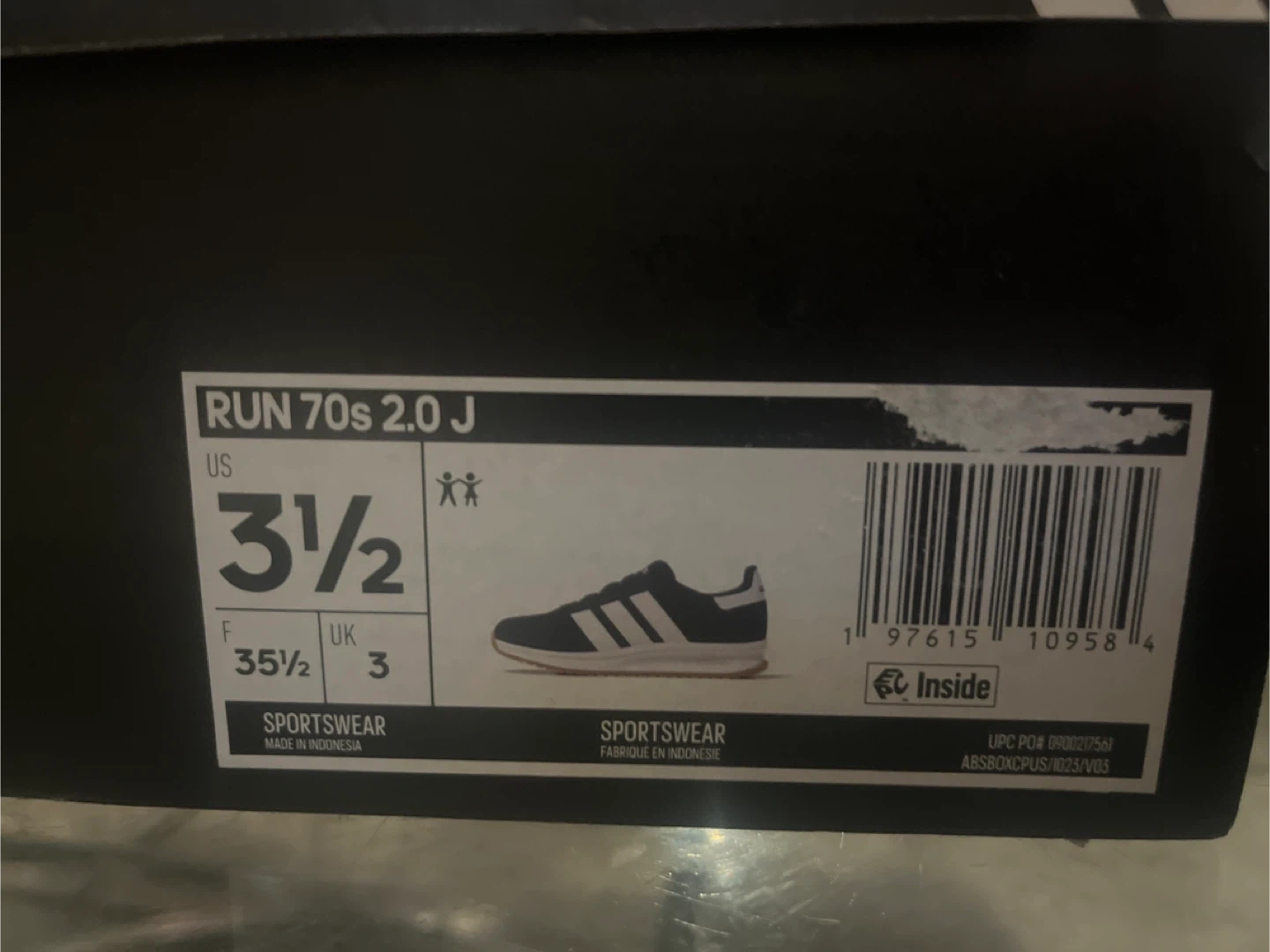 75Selling a pair of Adidas Run 70s 2.0 J sneakers in size 3.5 US. These sporty shoes feature the classic Adidas three-stripe design and a comfortable Cloudfoam sole. They are brand new and come with the original box!