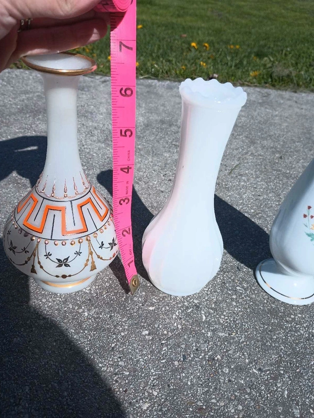 White and orange vase with beads: Some wear to the beads - see photos. Approximately 7in tall. White vase, imperfections, about 6in tall. White floral vase, imperfections, about 6in tall. Pick up near Banwell and the Expressway.