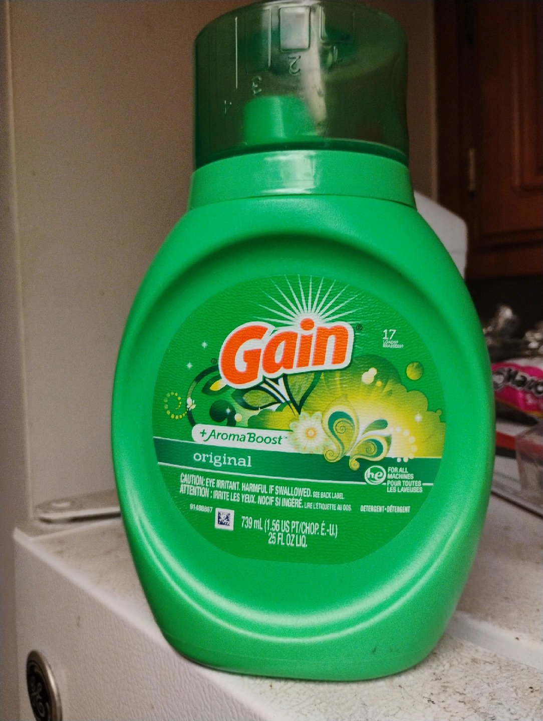 10I have a bottle of Gain Original liquid laundry detergent for sale. It's the one with Aroma Boost and comes in a 25 fl oz (739 mL) bottle. Great for all machines!