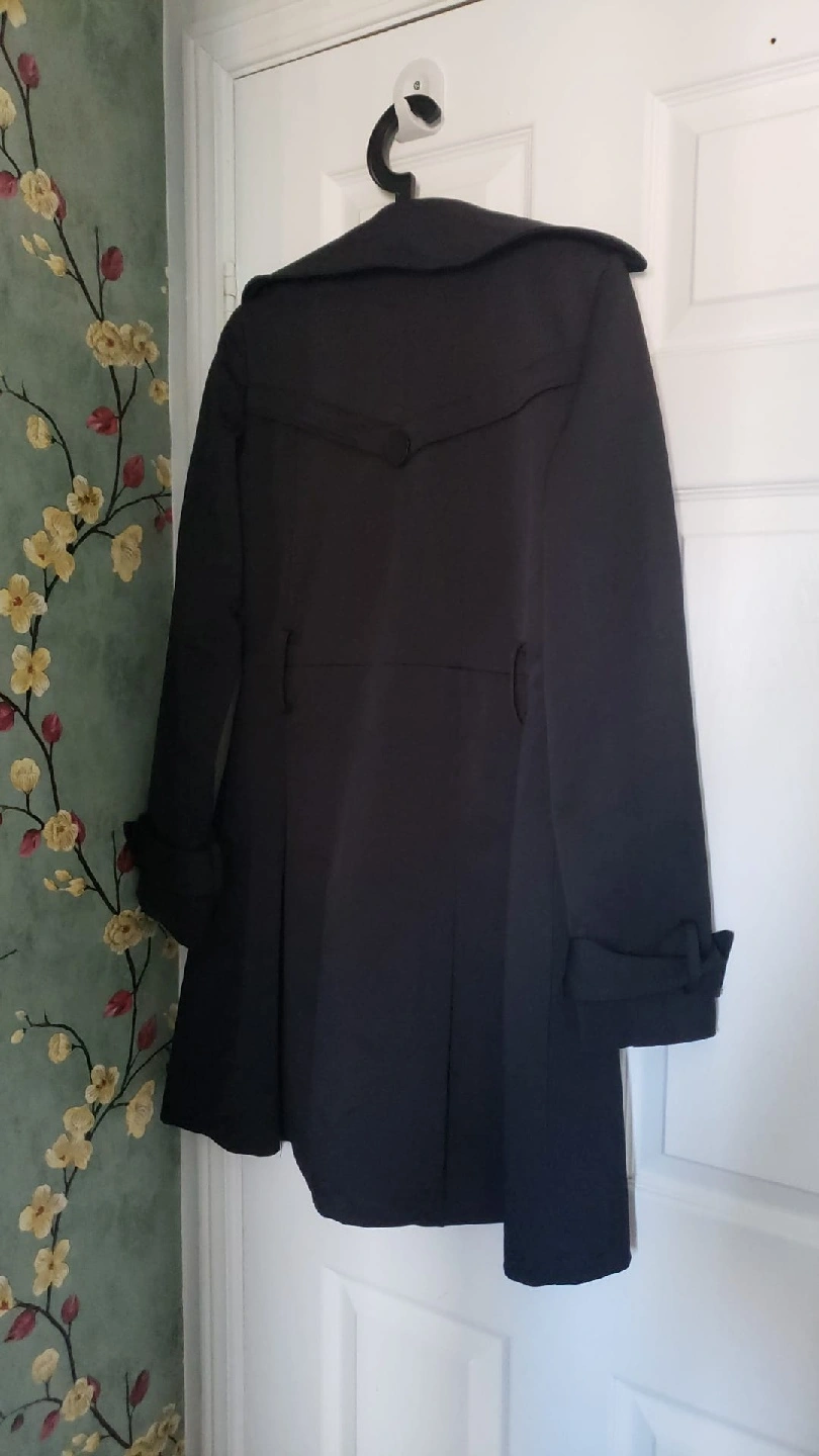 895Black trench coat. Three tiny nicks on left side. Chest 37 in. Length 34 in. Pick up at 40 Lavery Trail Scarborough M1C4T3 or 280 Donlands Avenue