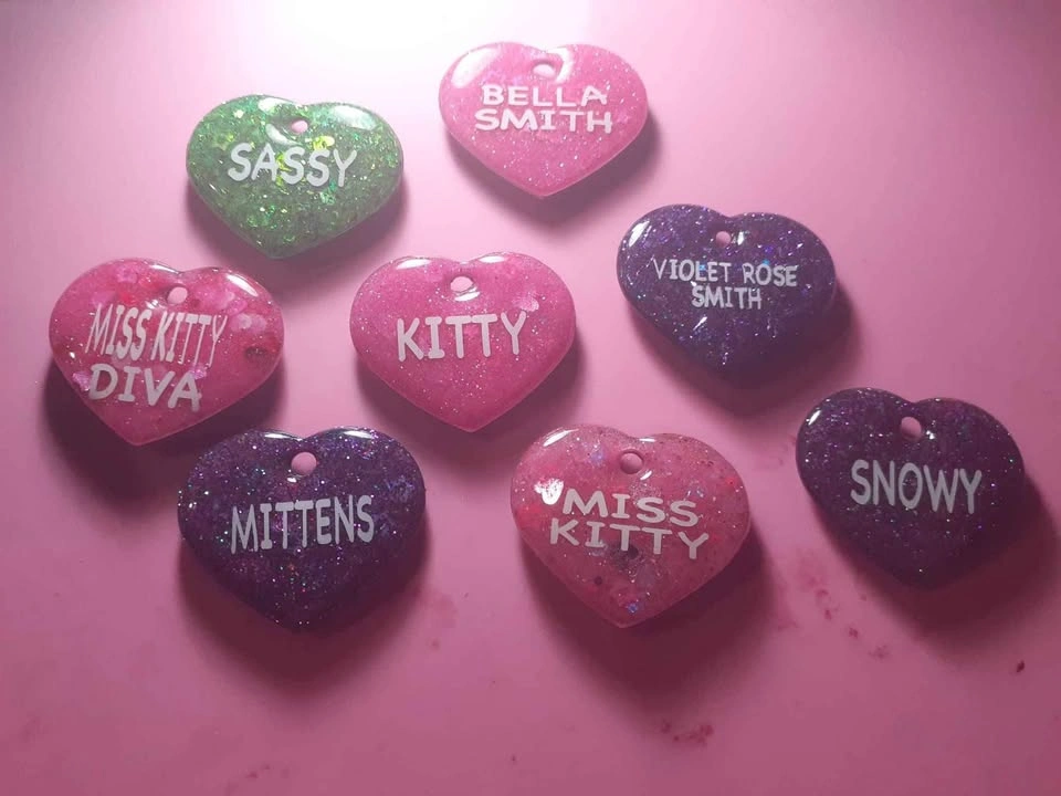 65Custom made pet tags: TY heart shaped tag, 3 sizes: sm, med or lrg -Glitter or original version Also available glitter pet tags. Include name on front and number on back. Available in bone or heart shape and any color. NOW AVAILABLE Glow in the Dark lettering. 20$ free shipping