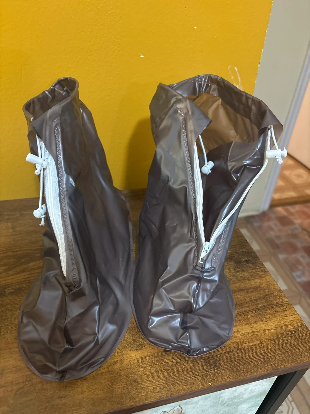 1000+Free a pair of brown waterproof shoe covers. They are great for keeping your shoes dry and clean in wet weather. They feature a zipper closure and drawstring for a secure fit