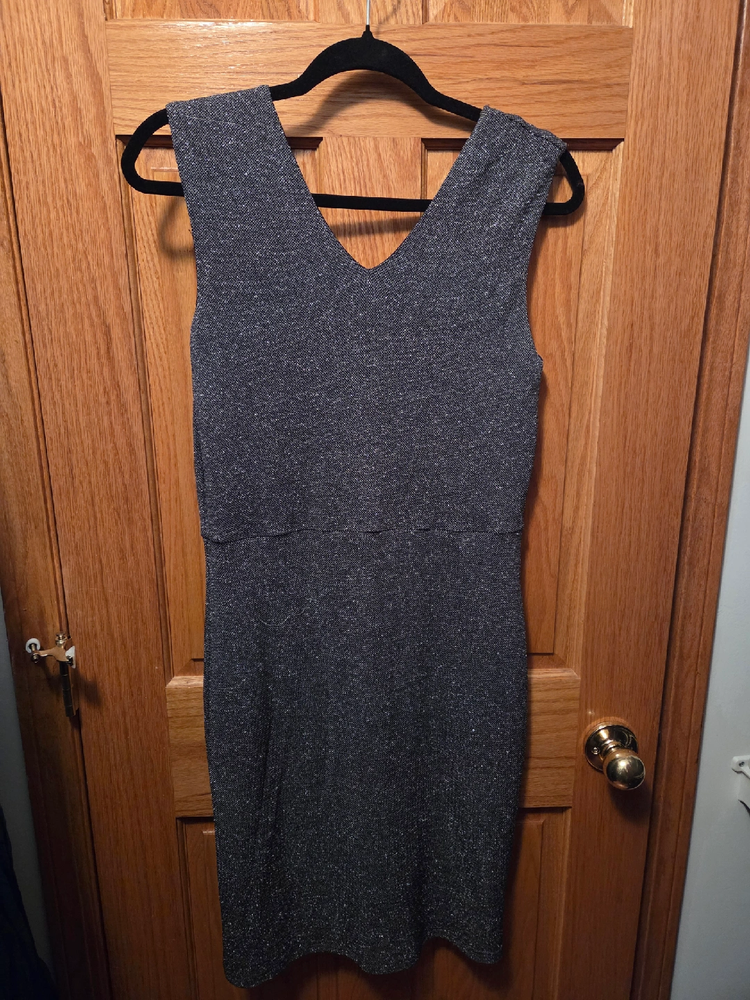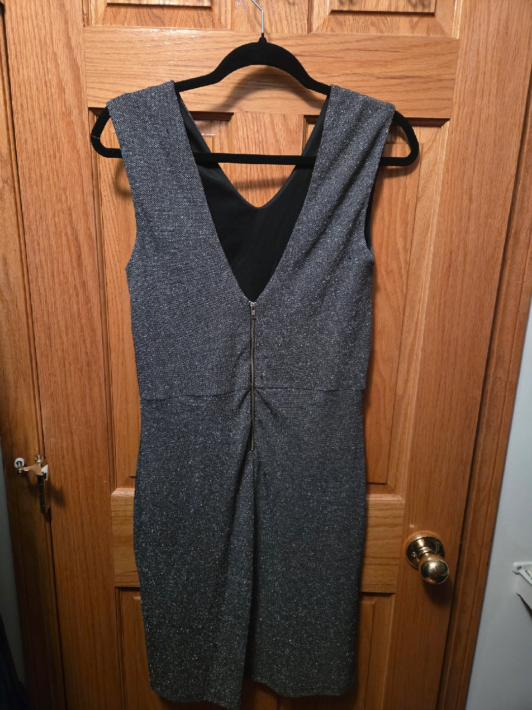47A simple sparkly gray dress! It has a V-neck in the front and back and a zipper in the back. Been worn once, pickup in Uptown!
