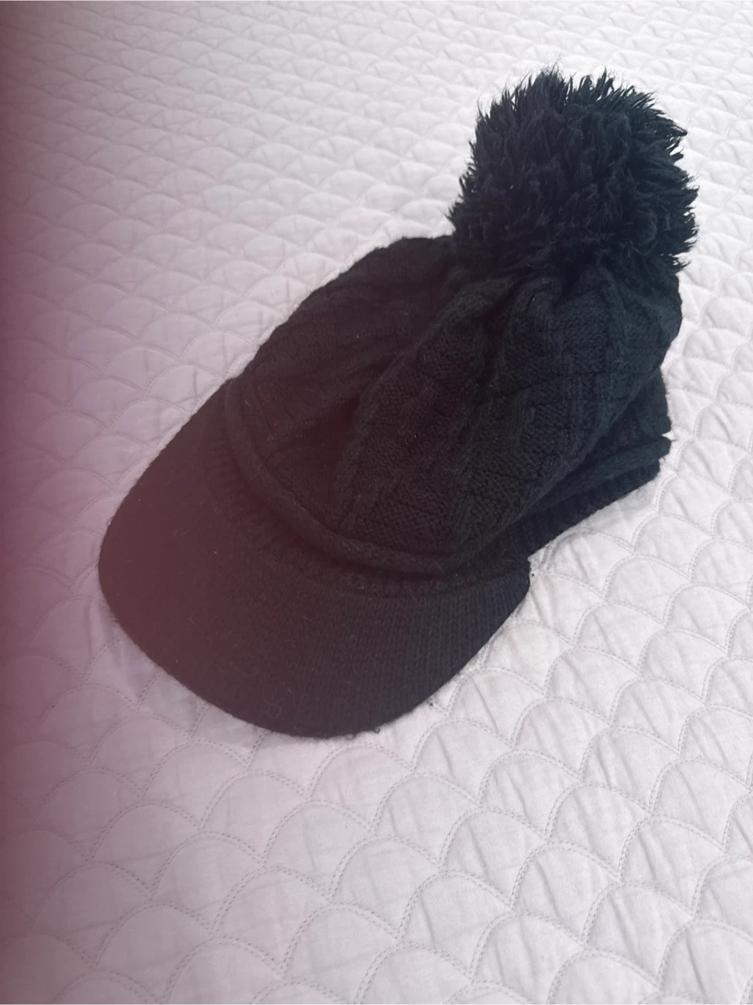 43Selling a black knit visor hat with a cute pom pom on top! It's in great condition and perfect for keeping you warm and stylish during cooler weather