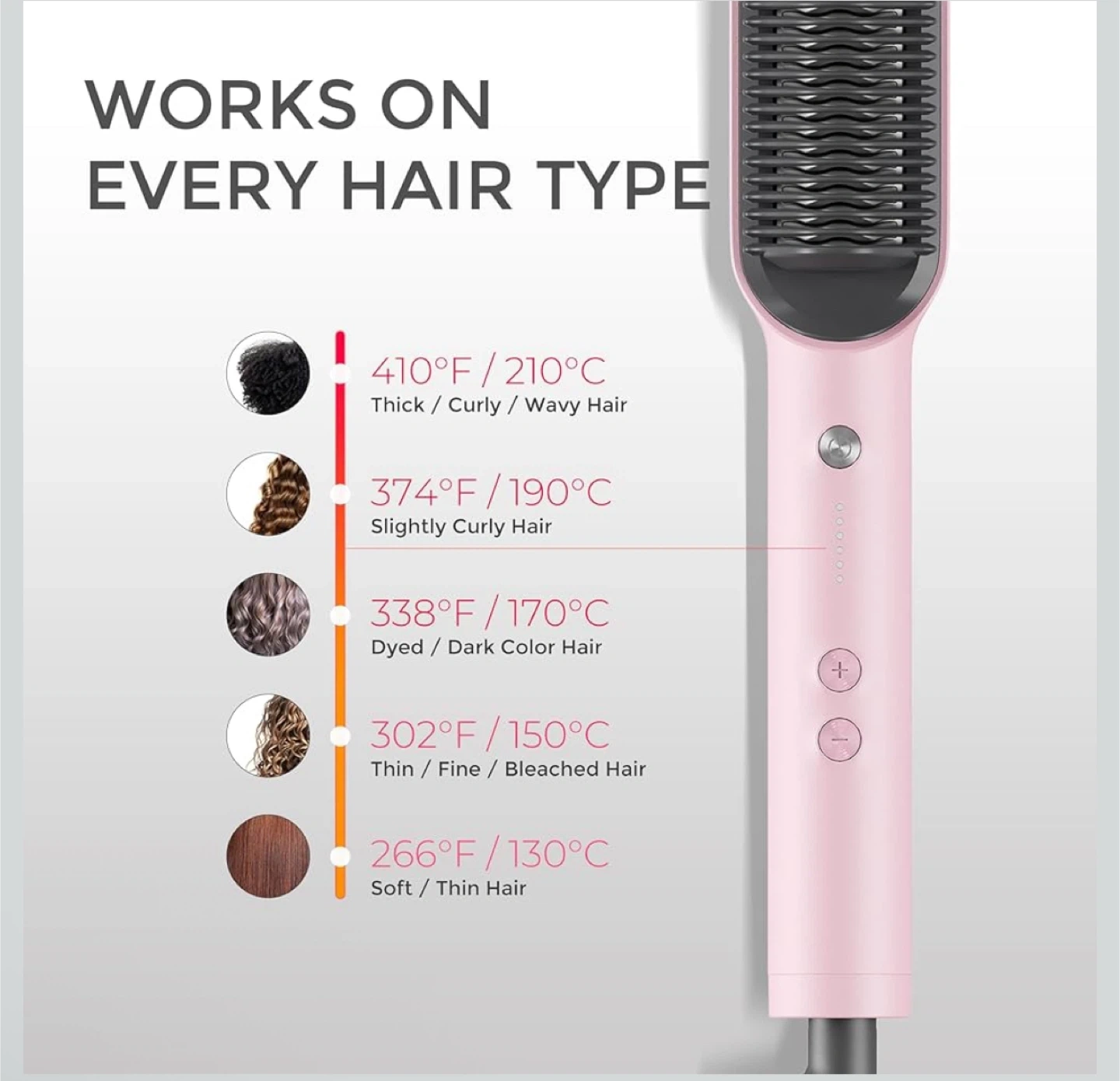 65This hair straightener brush works on every hair type! It features fast heating in 20 seconds and is gentle on hair, reducing heat damage by 50%. Great for speeding up your hectic mornings