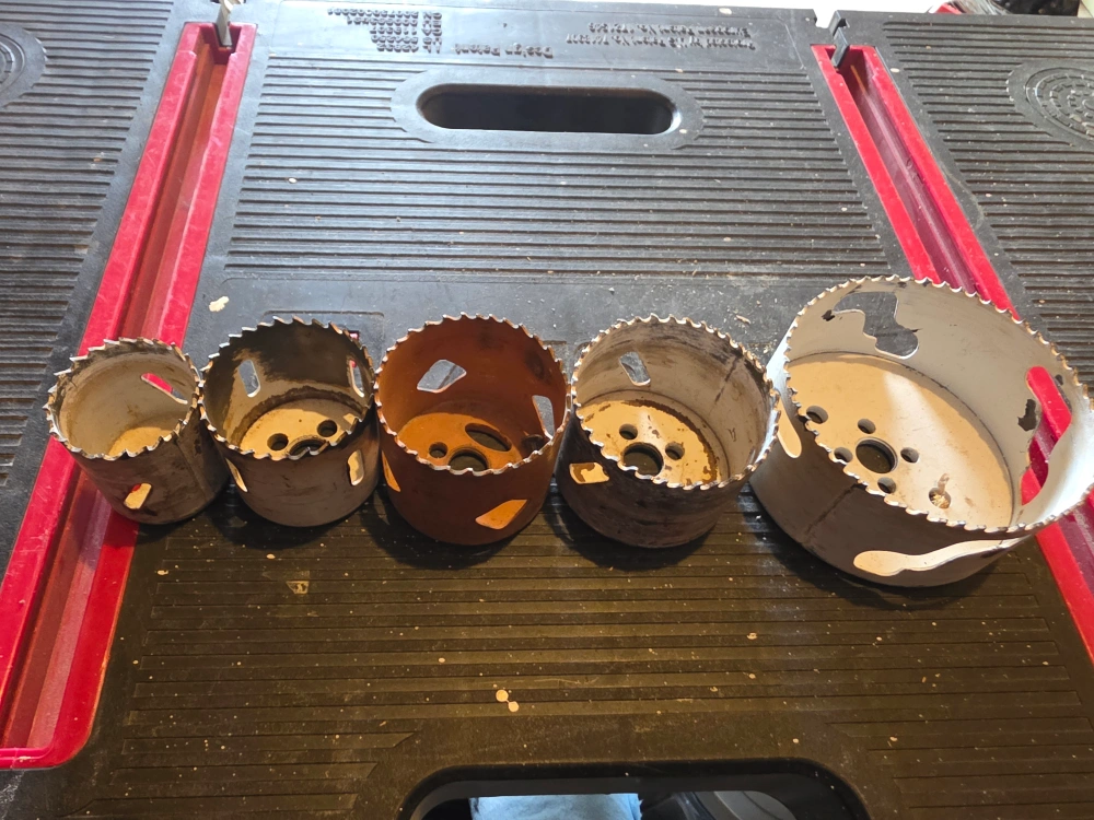 59Selling a set of used hole saws in various sizes. They show some signs of wear but are still functional for your drilling needs sizes are 3 7/8 2 1/2 2 1/4 2 1/8 1 3/4