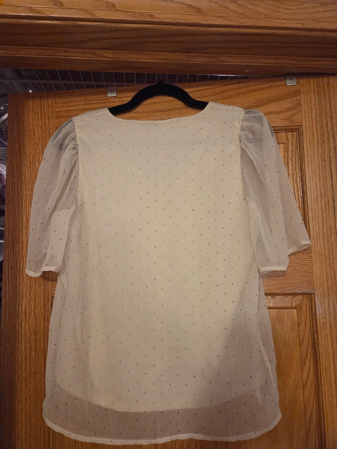 47This is a cute sheer blouse with a polka dot pattern. It has short, puffy sleeves and a v-neck. It's perfect for layering or wearing on its own in warmer weather. Pickup in Uptown, free with purchase of anything on my profile or if you're picking up multiple things.