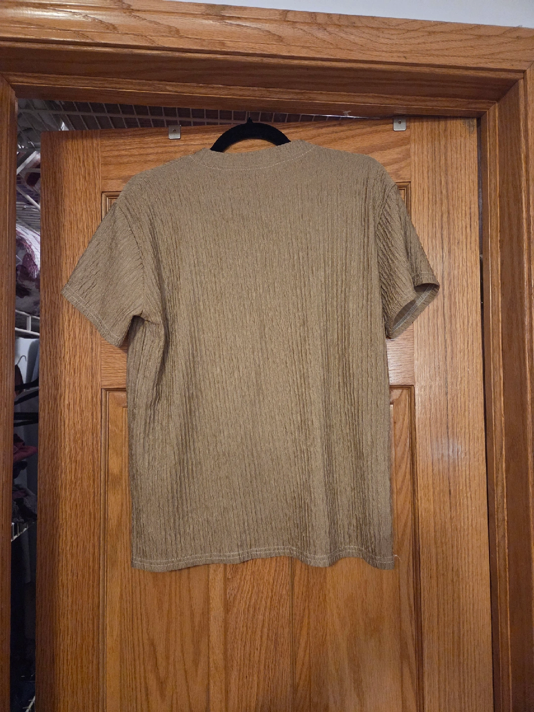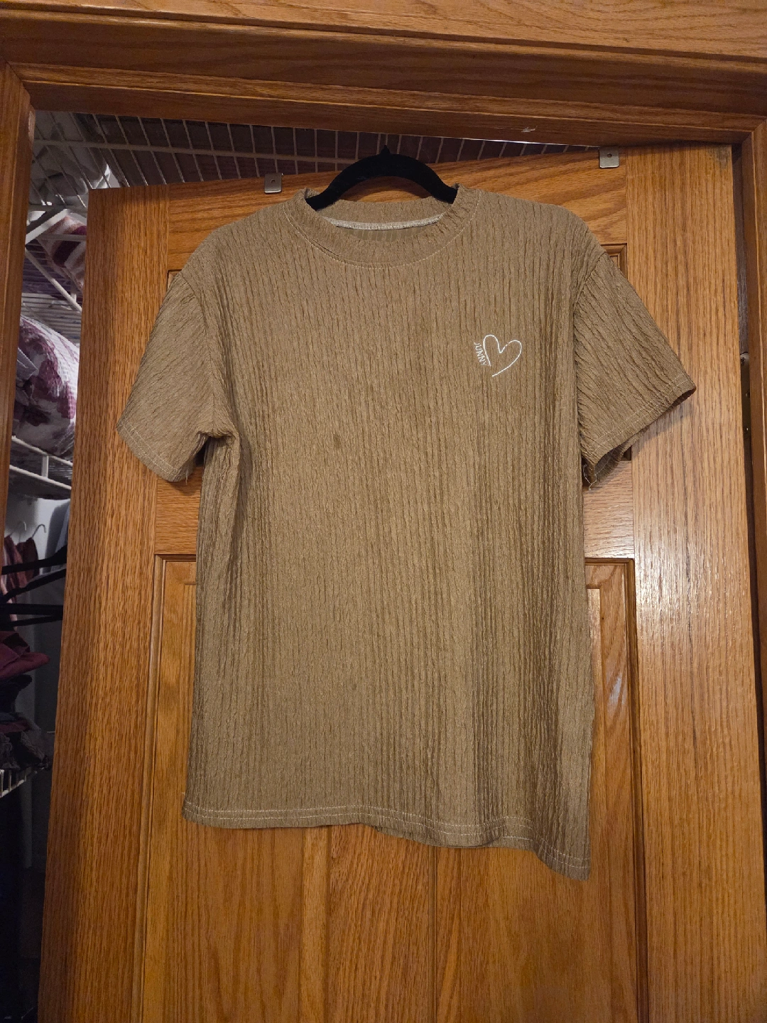 47Here's a cute brown textured t-shirt! It has a small heart design on the front. The shirt is in good condition and ready for a new home. Pickup in Uptown, free with purchase of anything on my profile or if you're picking up multiple things.