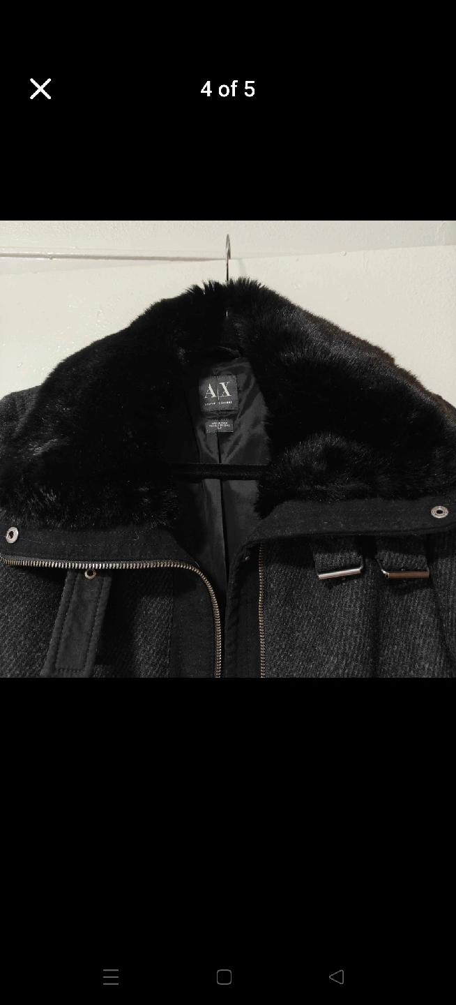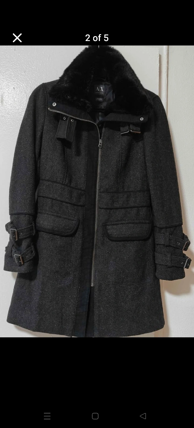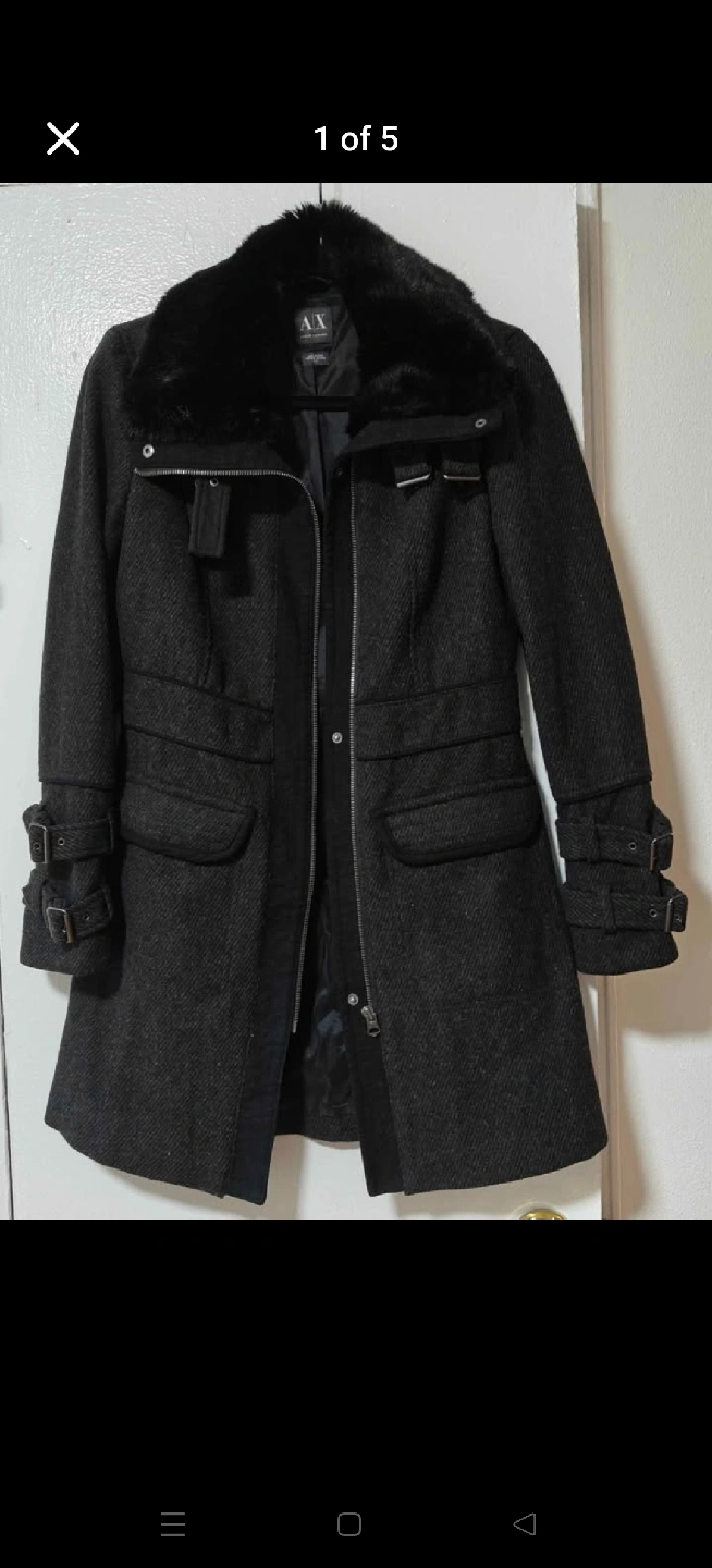 10Selling an Armani Exchange wool blend coat! It's a stylish coat with a faux fur collar and buckle details on the sleeves. The coat is in great condition and ready for a new owner
