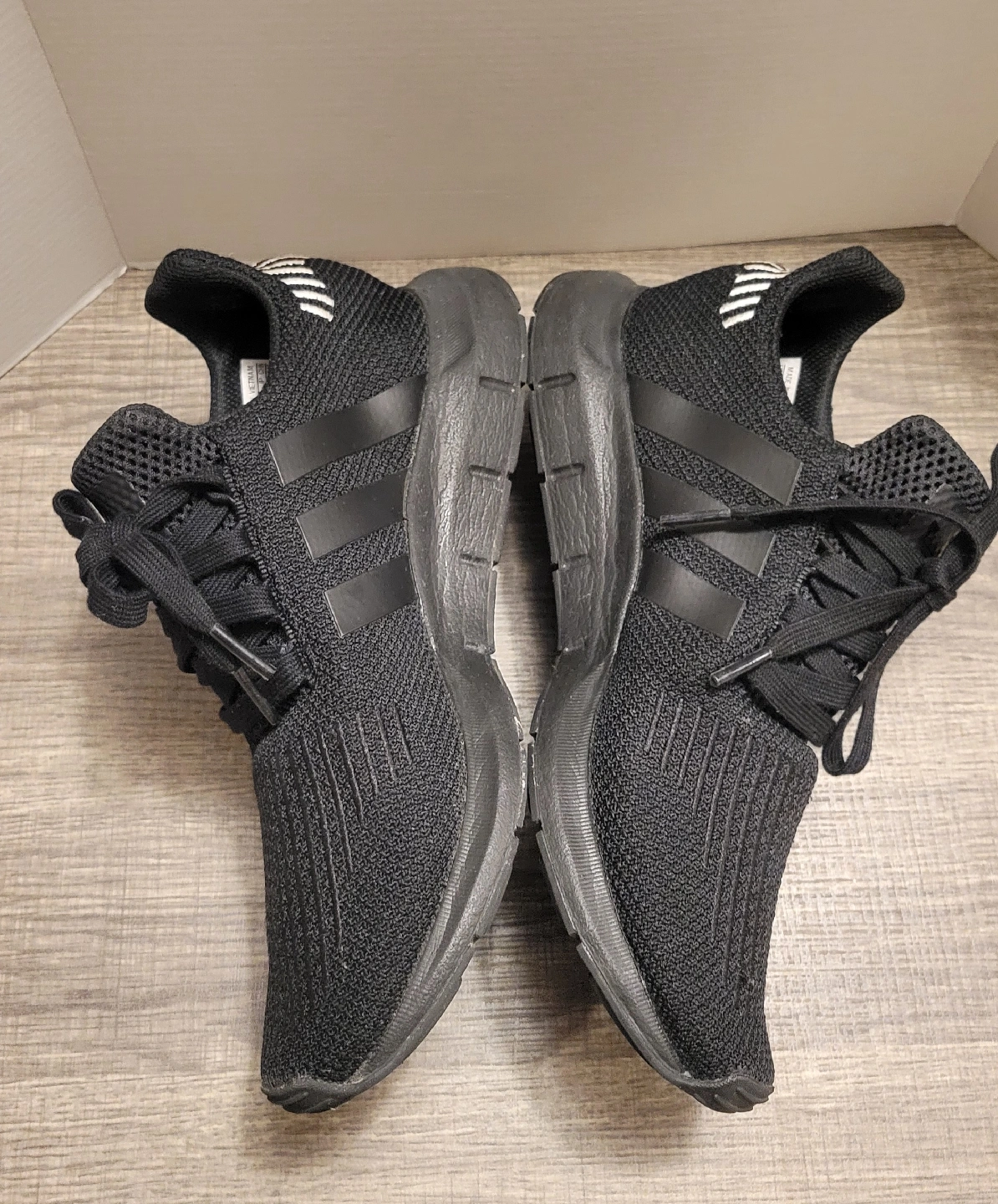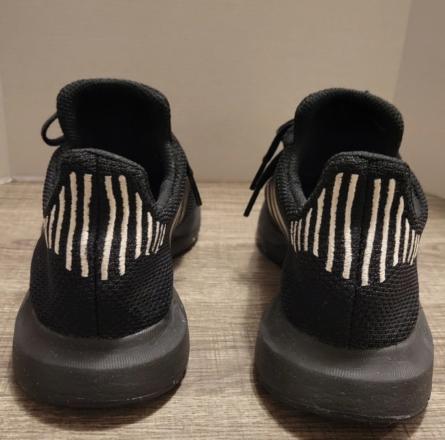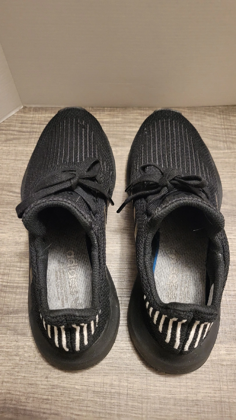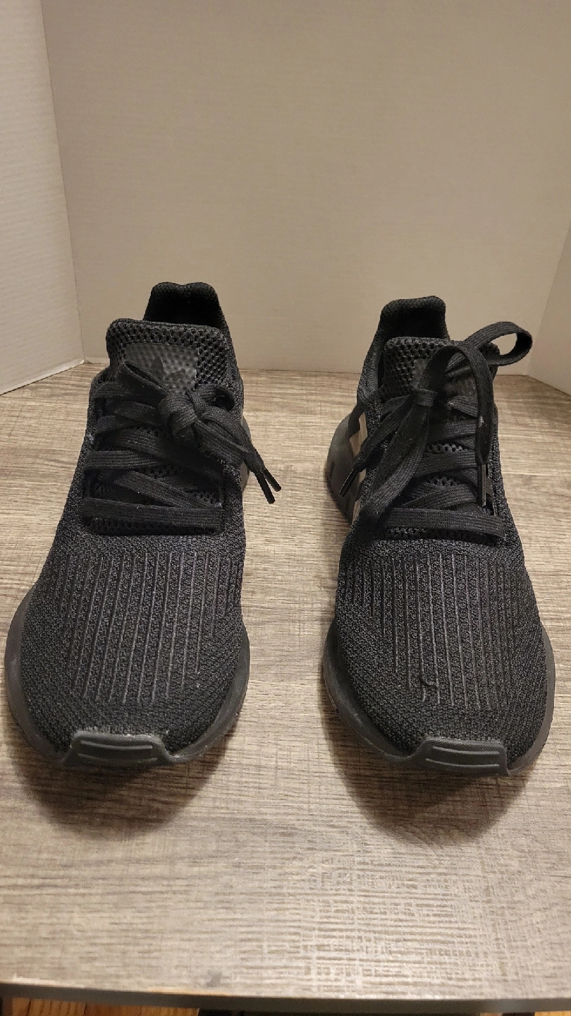 584Selling a pair of Adidas Swift Run sneakers in men's size 8. They are black with white stripes on the back. The size is US 8, UK 6 1/2, FR 40, JP 250, CHN 245. They are in great condition!