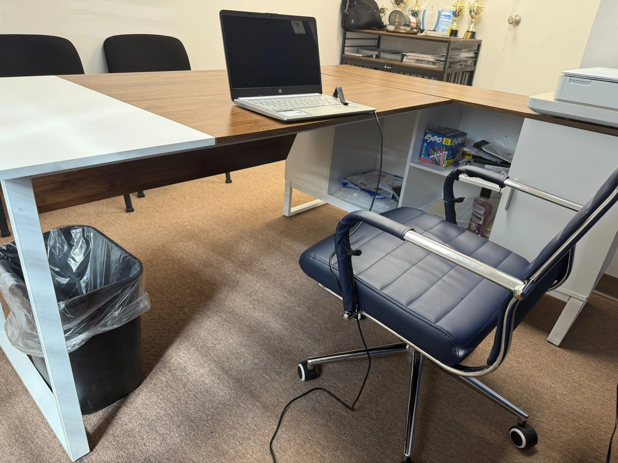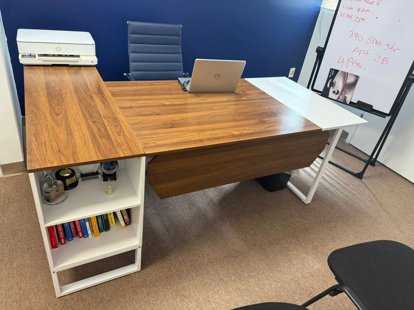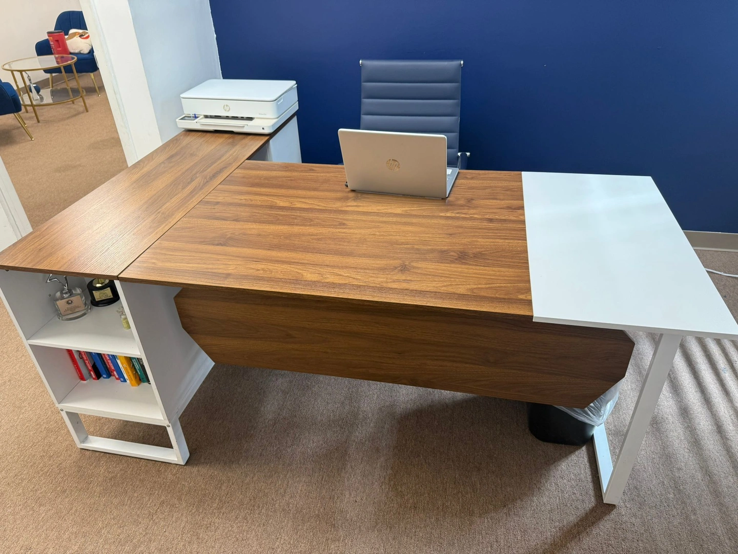 65Modern L-shaped desk. Material: laminated wood with white metal base. Large surface for laptop, documents, or printer. Built-in shelves for books and storage. In excellent condition, very little use. Perfect for professional offices or modern spaces at home.