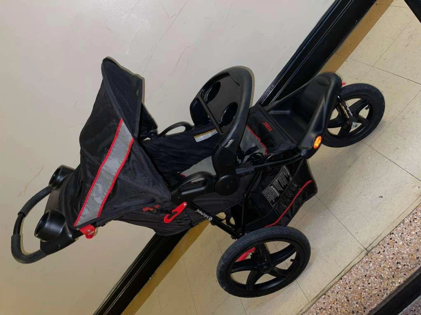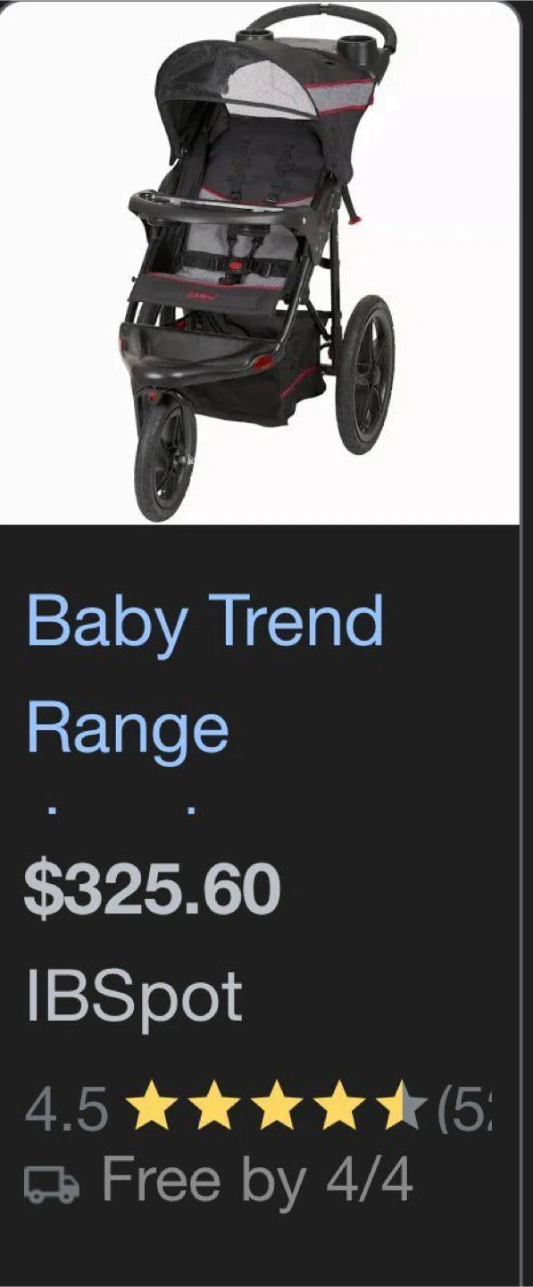 95Baby Trend Range Jogging Stroller, Millennium Baby Stroller The Baby Trend® Range Jogger combines all the comfort and convenient features for active families. With all terrain composite wheels this jogger provides excellent maneuverability and stability. The locking swivel wheel allows you to lock the front wheel in place when jogging and unlock it for easy low speed strolling. Two deep cupholders and covered compartment are handy additions for parents. The seat includes 5-point harness with padded covers to secure your child in place and expandable 3-tiered canopy to protect from harmful sun exposure. When resting, park the jogger with the foot activated, dual rear brakes. Effortless trigger-fold easily reduces this jogger to compact size for storage and portability. Create a travel system by adding a Baby Trend infant car seat (sold separately). Baby Trend Range Jogger Stroller: The Baby Trend Range Jogger Stroller is for a child from 6-50 lbs Max height limit: 42" tall Multi-position, reclining, padded seat Fully adjustable, 5-point safety harness and tether strap Adjustable canopy with covered sunroof ratchets to block sun and wind Extra-large storage basket Covered parent compartment 2 cup holders This baby jogger stroller accepts all Baby Trend infant car seat models 16" rear and 12" front all-terrain, rubber bicycle tires Locking front swivel wheel Foot-activated rear brake system Extra-wide, ergonomically shaped, foam padded handle Footrest reflectors provide greater low-light visibility Effortless trigger fold easily reduces stroller to a compact unit Assembled weight: 23.32 lbs Lightweight, steel frame construction Pads are covered with a soft and luxurious polyester fabric with polyester fill The baby jogger stroller is JPMA certified Some assembly required Baby Trend Range Stroller Model# JG99773. Directions: Fabric Care Instructions: Spot Clean Specifications Features Canopy, Number of Cup Holders, Swivel Front Wheel, Parent Console, Locking Wheel Brand Baby Trend Gender Unisex Color Millennium Maximum Weight 50 lbs Stroller Style Jogging Strollers