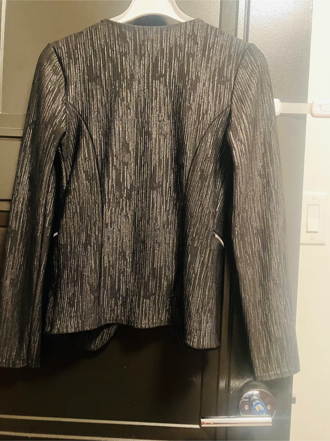 124This is a Crème Fraîche blazer in size small. It's a stylish black colour with a unique texture. The material is 92% polyester and 8% elastane, making it comfortable and stretchy. Great for adding a bit of sparkle to your outfit! Pet and smoke free home Cash only
