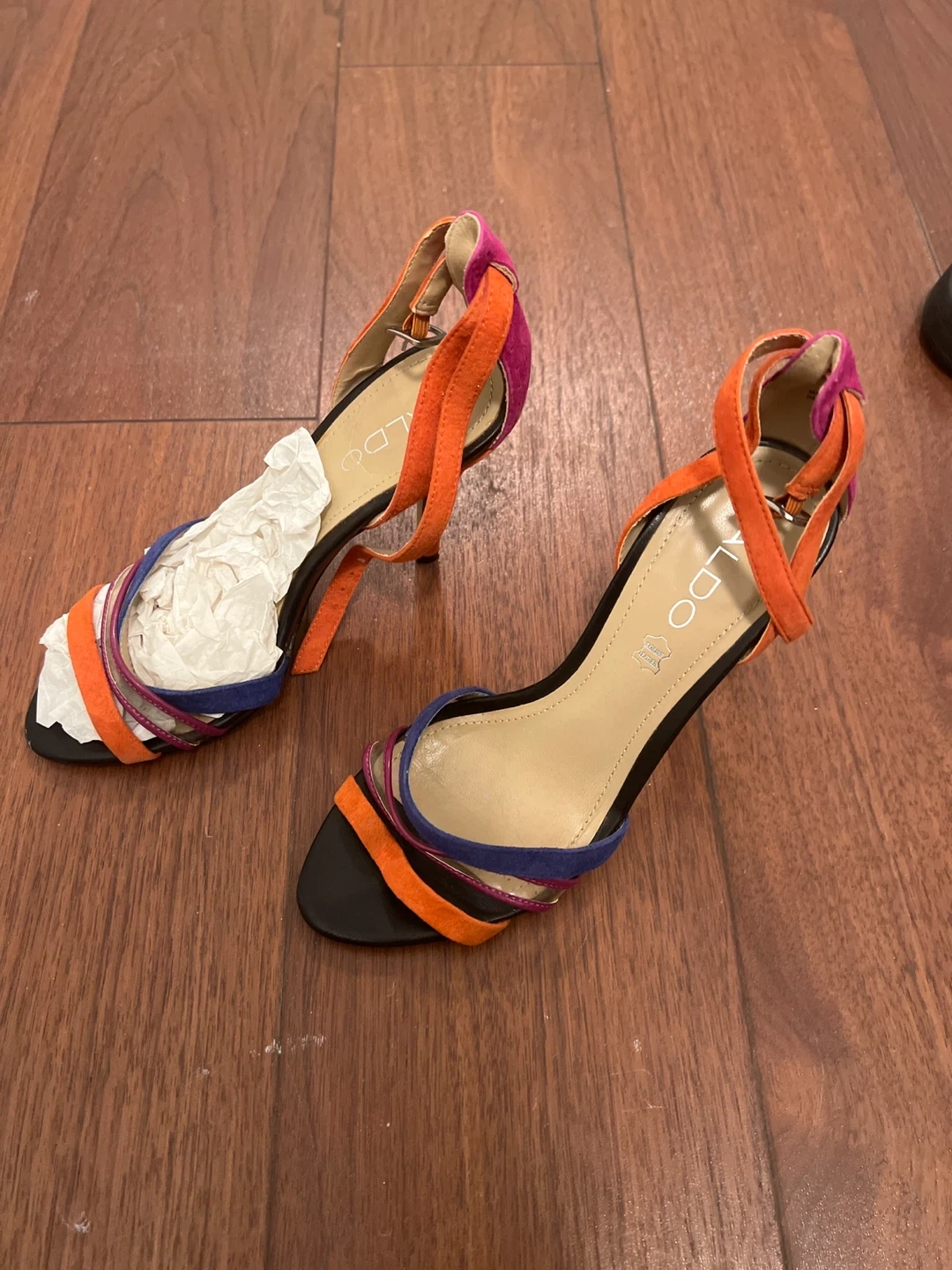 130These ALDO heels are super cute with a mix of orange, purple, and blue suede straps. They're in great condition and ready for a new home!