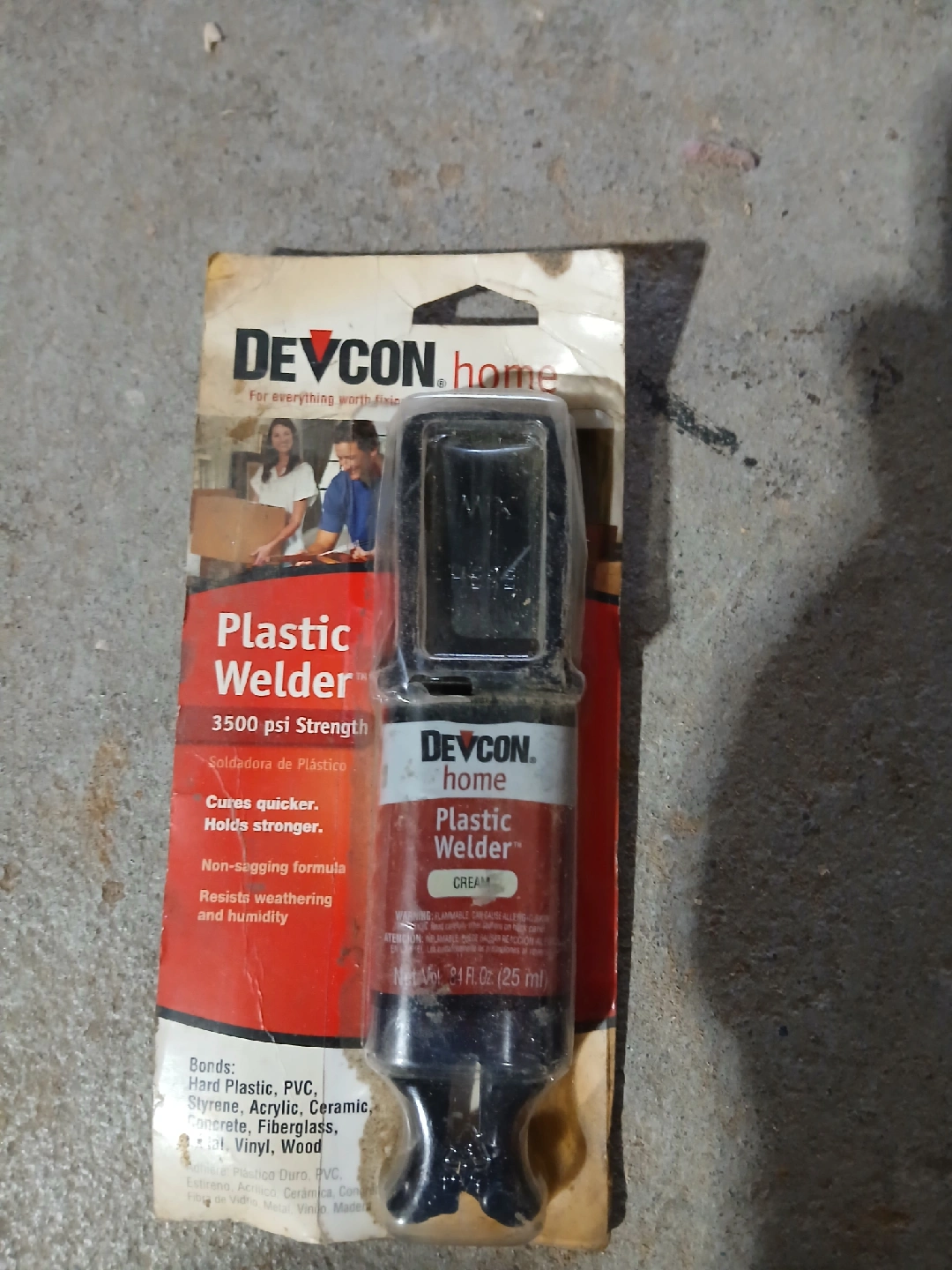 60Devcon Home Plastic Welder for everything worth doing. It has a 3500 psi strength and cures quicker. It also holds stronger and resists weathering and humidity. Bonds hard plastic, PVC, styrene, acrylic, ceramic, concrete, fiberglass, metal, vinyl, and wood