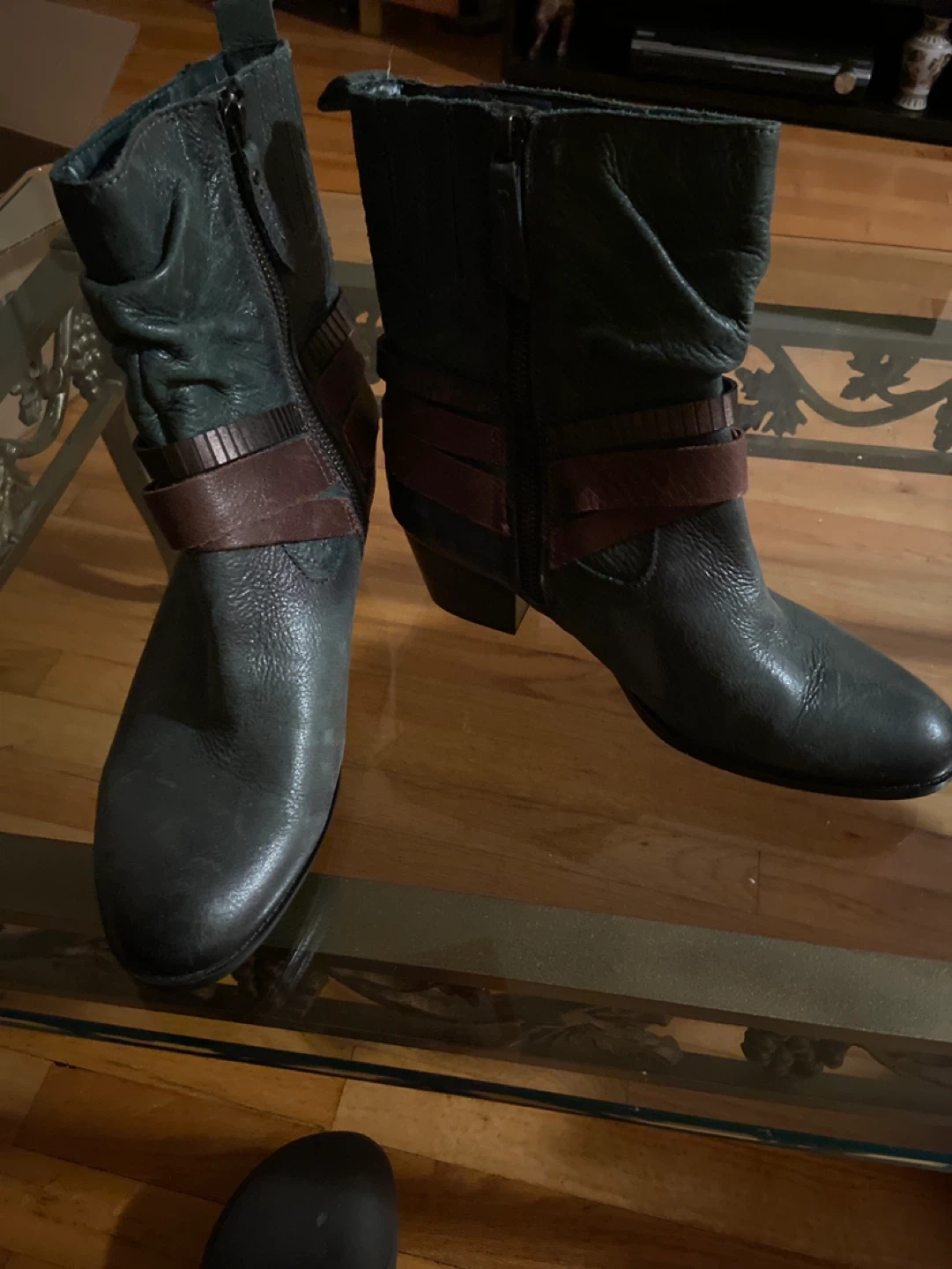 10Selling a pair of Spruce Green leather boots. They feature a stylish strap detail and a convenient side zipper. These boots are perfect for adding a touch of rugged charm to your wardrobe