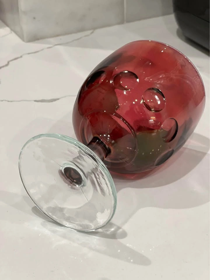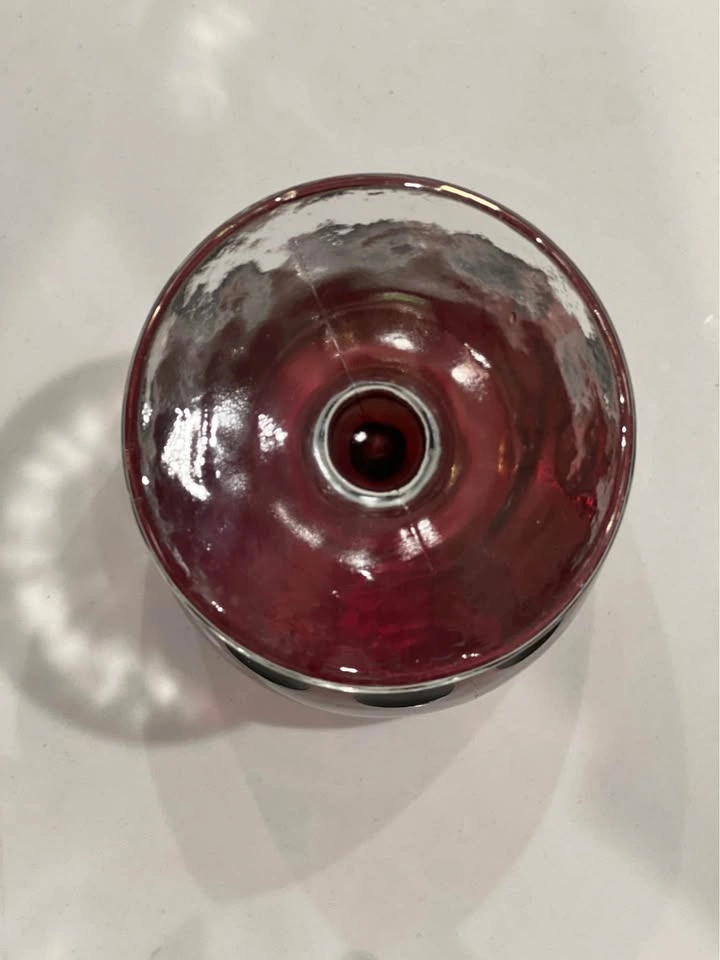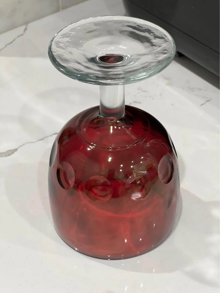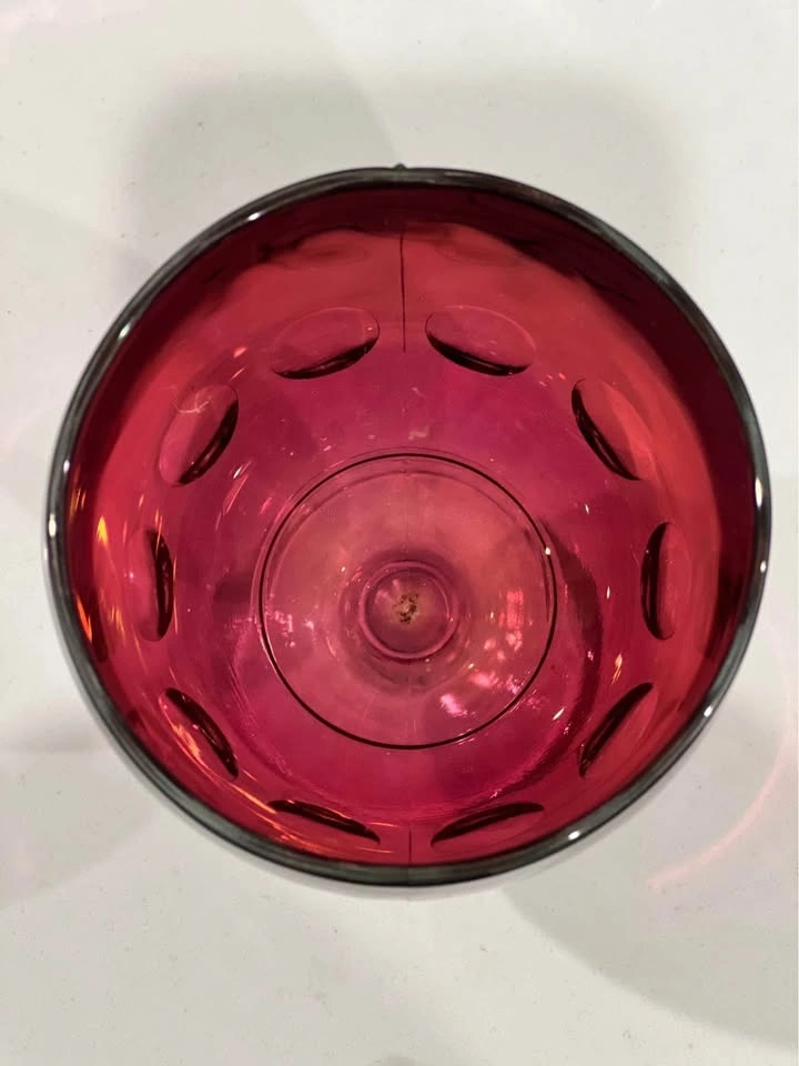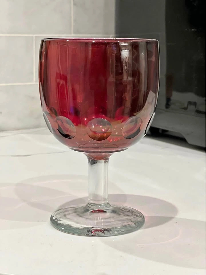 98This is a vintage Bartlett Collins cranberry red thumbprint goblet. This type of glassware was manufactured in the mid-20th century, with some pieces dated to the 1960s and 1970s. It is also referred to as a "water goblet" or "wine glass". The glasses feature a "thumbprint" or "coin" design and a cranberry red color. 6” height, 3.75” width