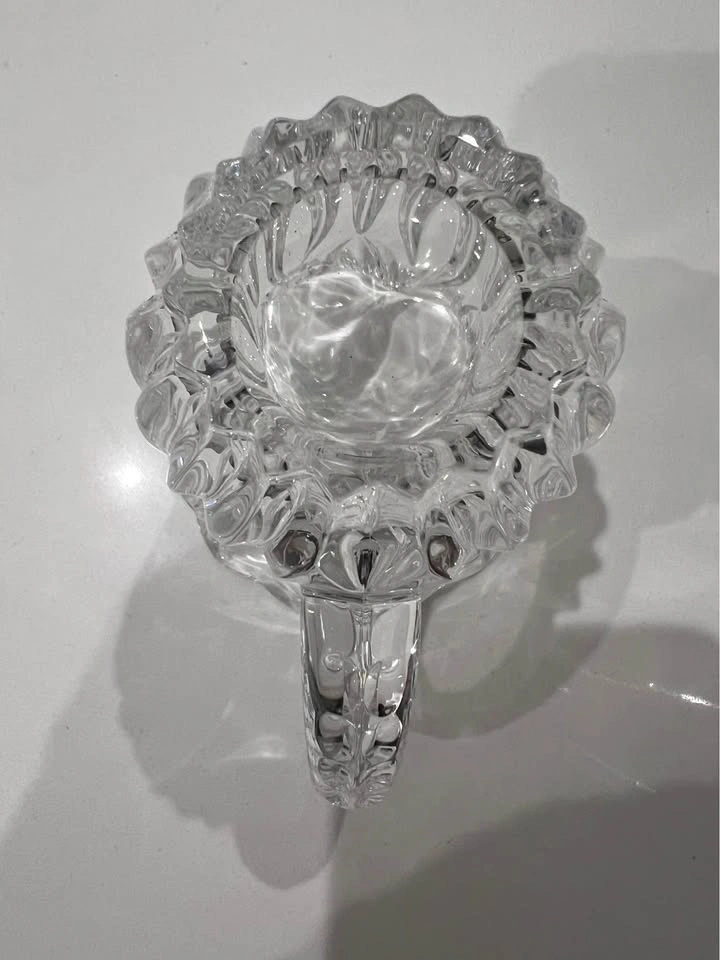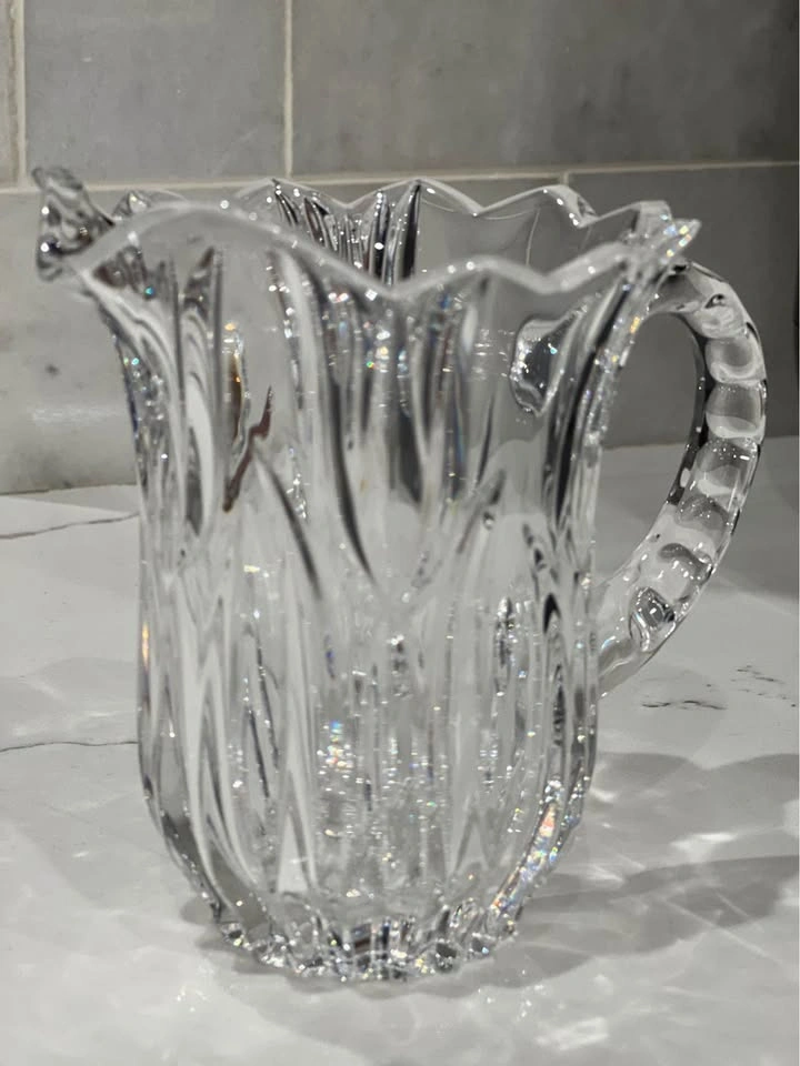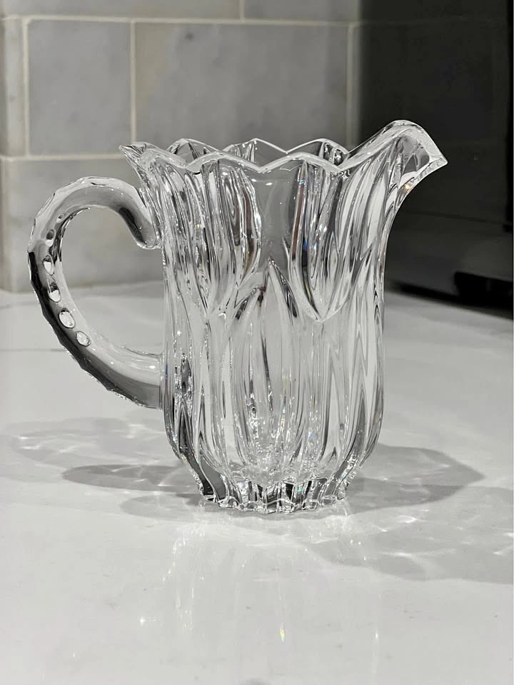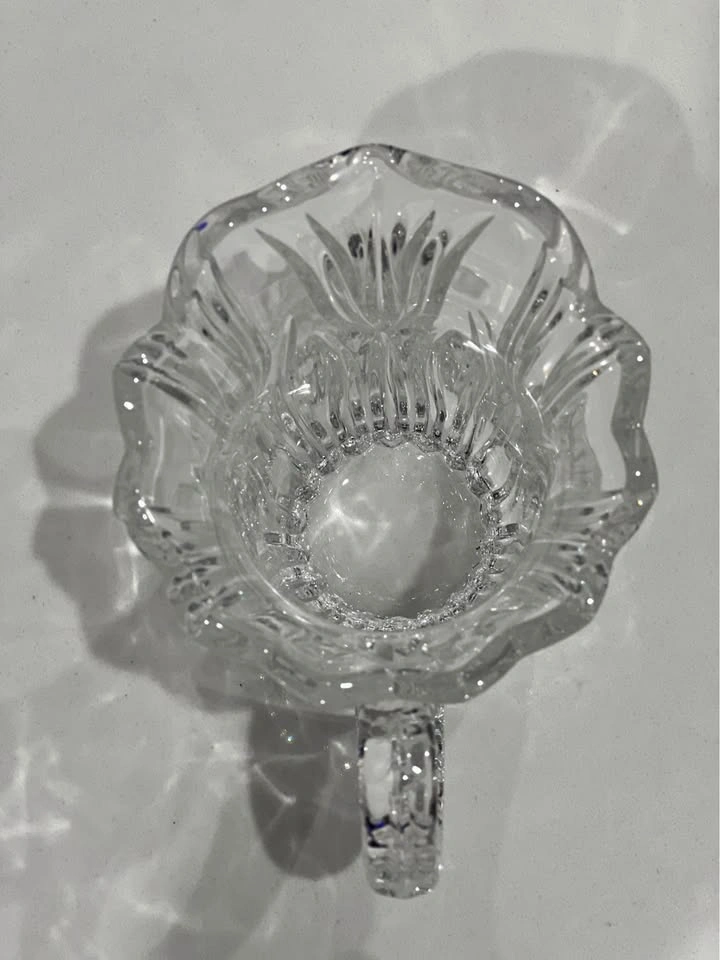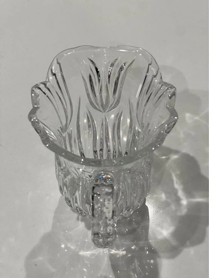 131Gorham Crystal Tulip creamer. This pattern, also known as "Tulip (Giftware)," was produced by Gorham Crystal between 1996 and 2000. The pieces are often made of full lead crystal. The design features a scalloped rim and vertical cuts that resemble a tulip and its leaves. This pattern is now discontinued. Height: 4 in Width: 3 5/8 in Special Characteristics: 8 OZ