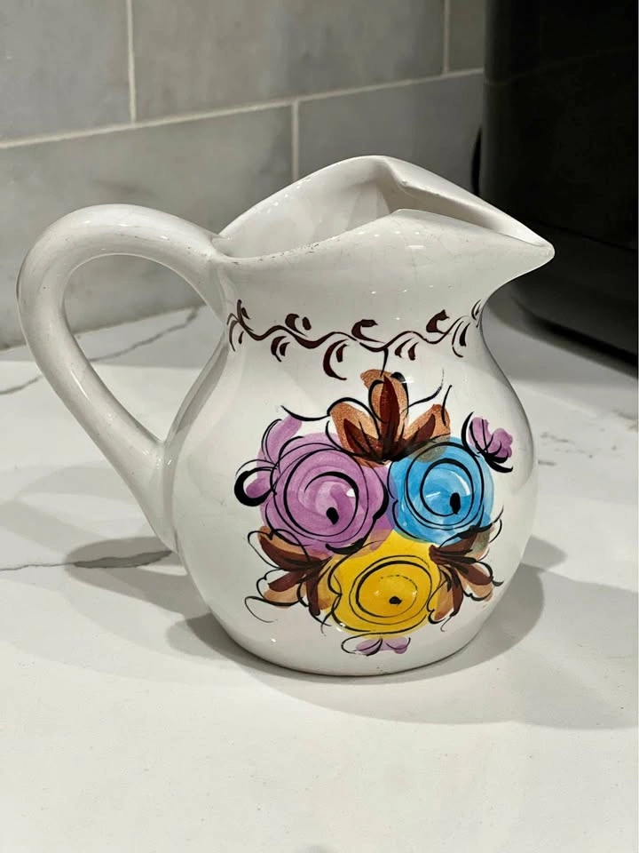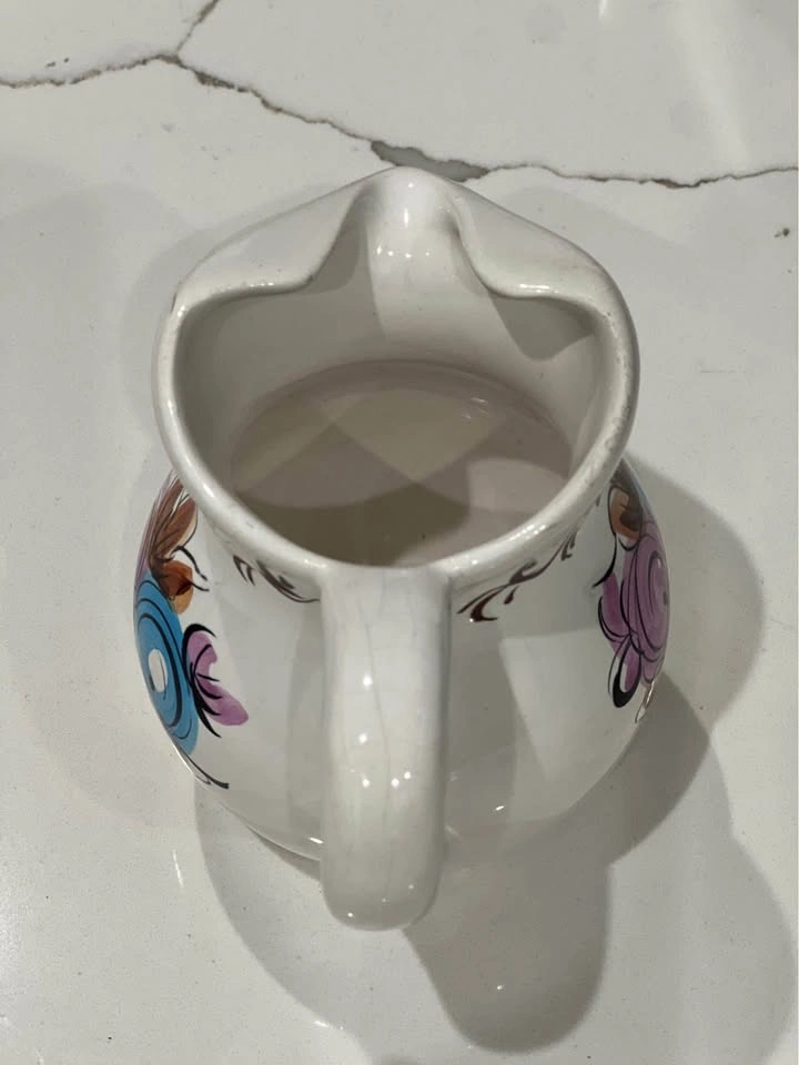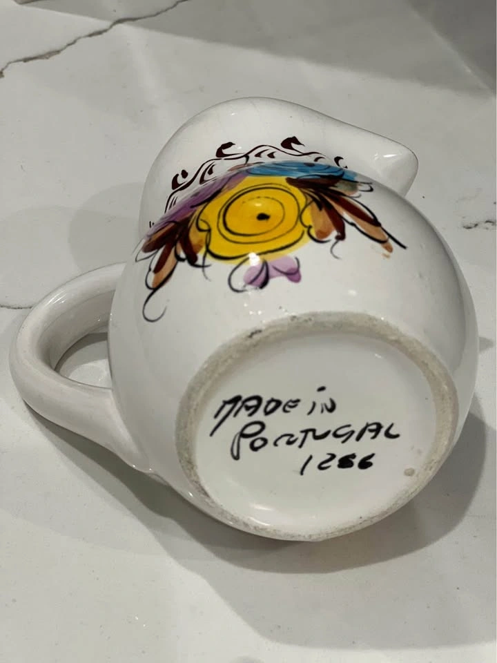 98Ceramic pitcher from Portugal, nice large handle and spout, white base with a abstract rose design in mauve, blue and yellow. There is a brown filigree, hand painted, marked on bottom and measures 5.25” across the handle edge to spout end with a height of 4.5”.